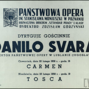08.06.1958–21.06.1958Afisz spektakli Carmen Georges’a Bizeta i Tosca Giacoma Pucciniego z gościnnym udziałem dyrygenta Danila Svary