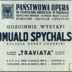 10.11.1961–12.11.1961Afisz gościnnego występu solisty Romualda Spychalskiego w spektaklu operowym Traviata Giuseppe Verdiego