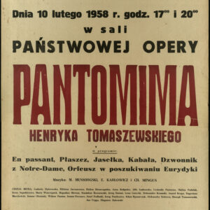 20.02.1958–23.02.1958Afisz gościnnego występu tancerzy Teatru Pantomimy Henryka Tomaszewskiego w spektaklach En passant, Płaszcz, Jasełka, Kabała, Dzwonnik z Notre-Dame i Orfeusz w poszukiwaniu Eurydyki