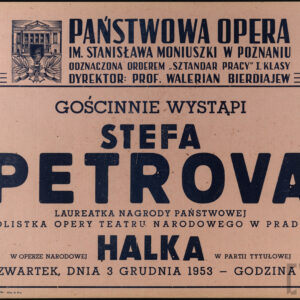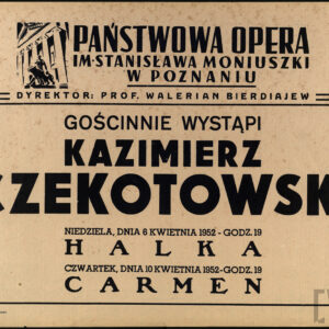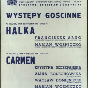 10.02.1958Afisz gościnnych występów solistów Państwowej Opery w Warszawie i Wrocławiu w spektaklach Halka Stanisława Moniuszki i Carmen Georges’a Bizeta na deskach Opery poznańskiej