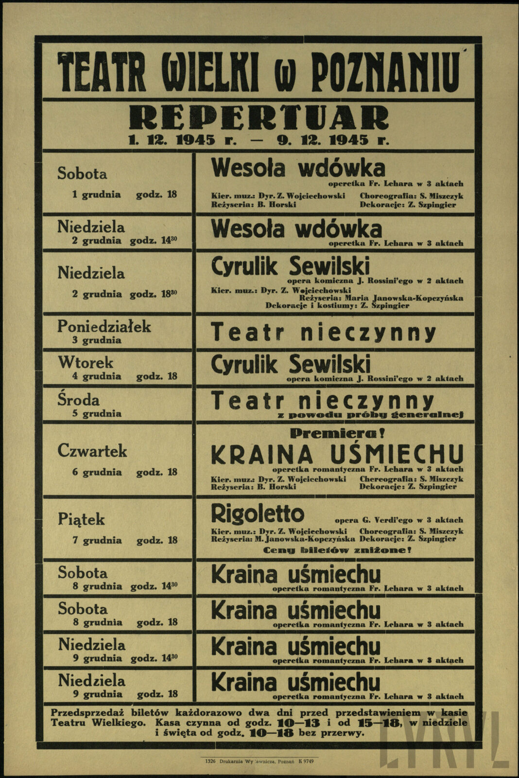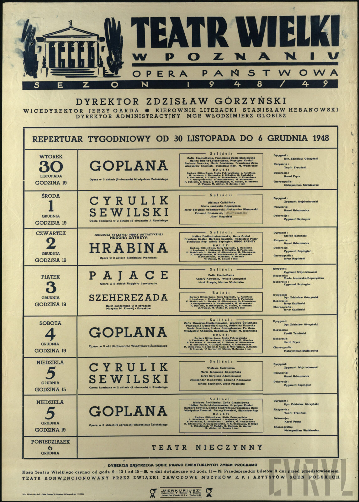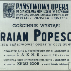 28.11.1957Afisz gościnnego występu rumuńskiego solisty Traiana Popescu w spektaklach operowych Lakmé Léo Delibes’a i Kniaź Igor Aleksandra Borodina