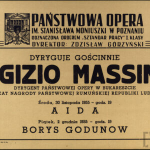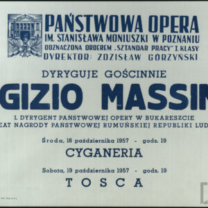 24.10.1957–27.10.1957Afisz spektakli operowych Cyganeria i Tosca Giacoma Pucciniego z gościnnym udziałem rumuńskiego dyrygenta Egizia Massiniego