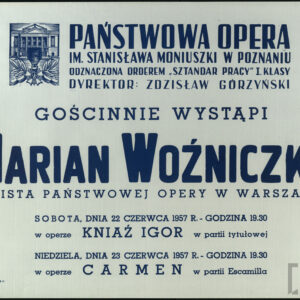 16.10.1957–19.10.1957Afisz gościnnych występów solisty Mariana Woźniczego w spektaklach operowych Kniaź Igor Aleksandra Borodina i Carmen Georges’a Bizeta