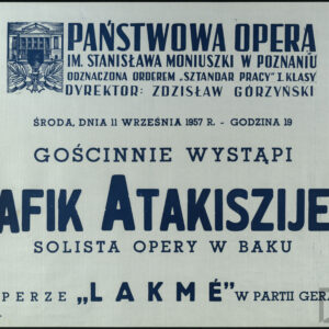 22.06.1957–23.06.1957Afisz gościnnego występu solisty opery w Baku Pafika Atakiszijewa w spektaklu operowym Lakmé Léo Delibes’a