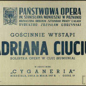 22.05.1957–23.05.1957Afisz gościnnego występu rumuńskiej solistki Adriany Ciuciu w spektaklu operowym Cyganeria Giacoma Pucciniego