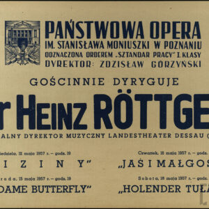 26.05.1957Afisz spektakli operowych Niziny Eugena d’Alberta, Madame Butterfly Giacoma Pucciniego, Jaś i Małgosia Engelberta Humperdincka i Holender tułacz Richarda Wagnera z gościnnym udziałem dyrygenta dr Heinza Röttgera