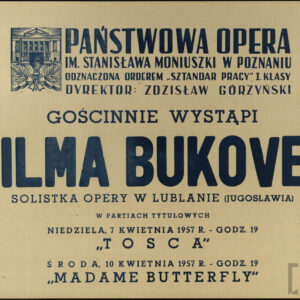 12.05.1957–18.05.1957Afisz gościnnych występów solistki z Opery w Lublanie Vilmy Bukovec w spektaklach operowych Tosca i Madame Butterfly Giacoma Pucciniego