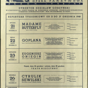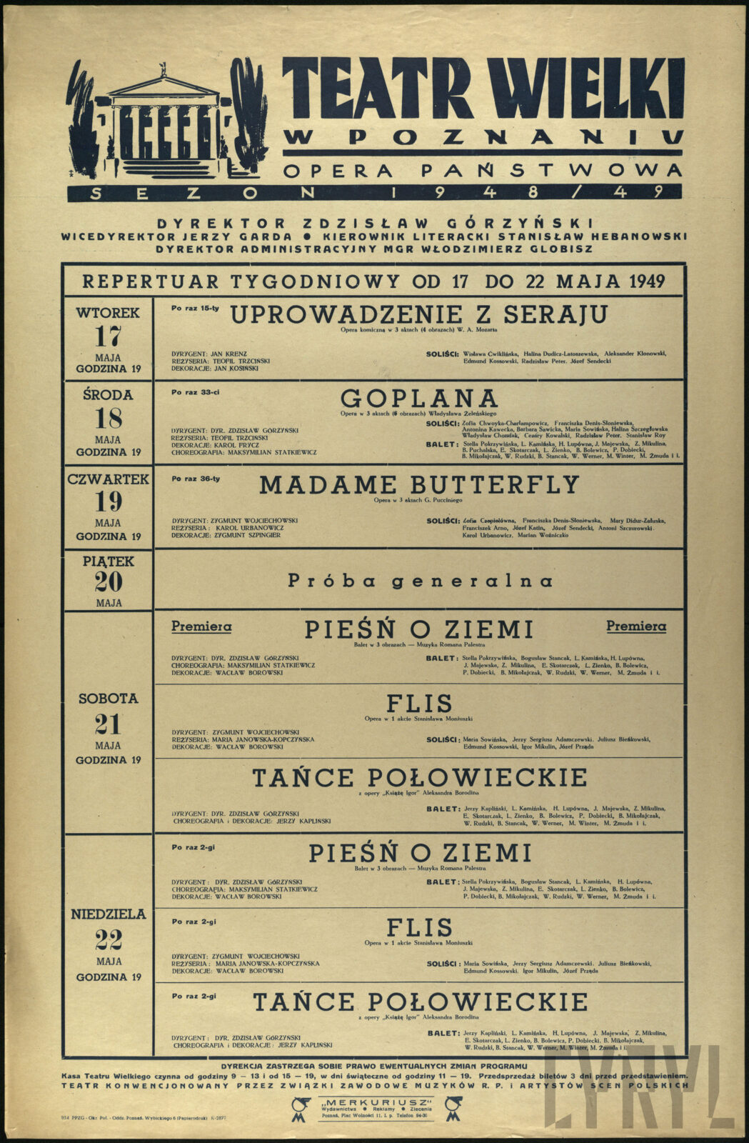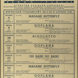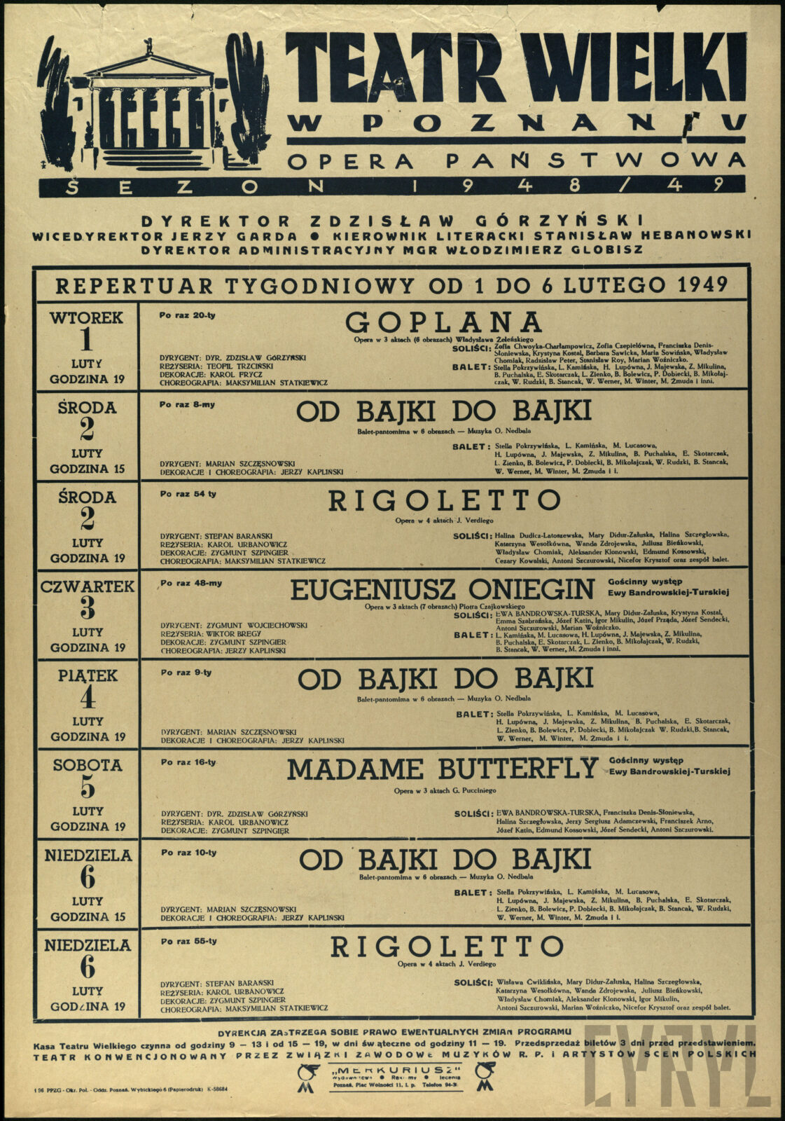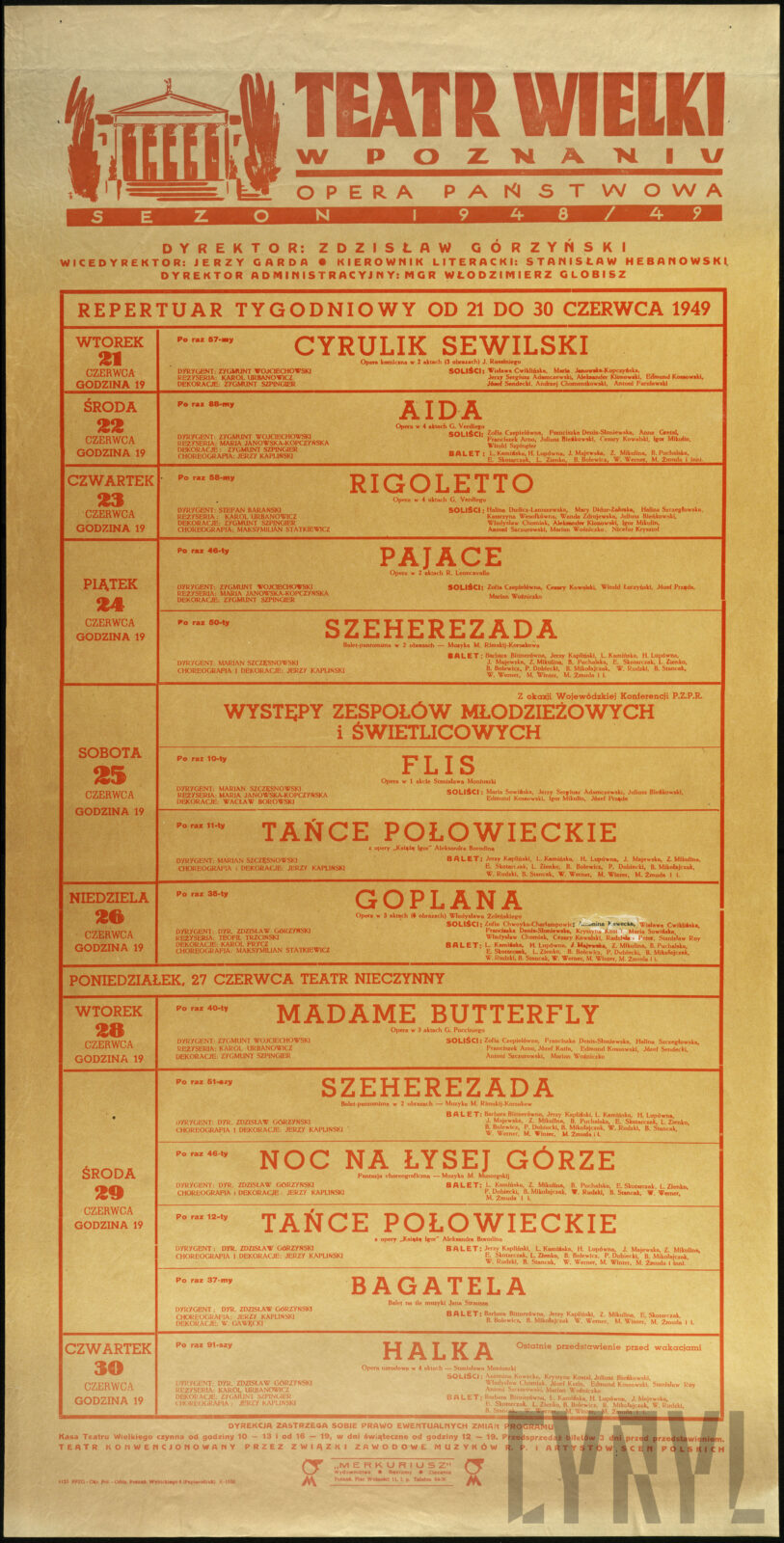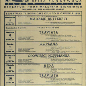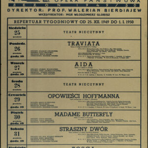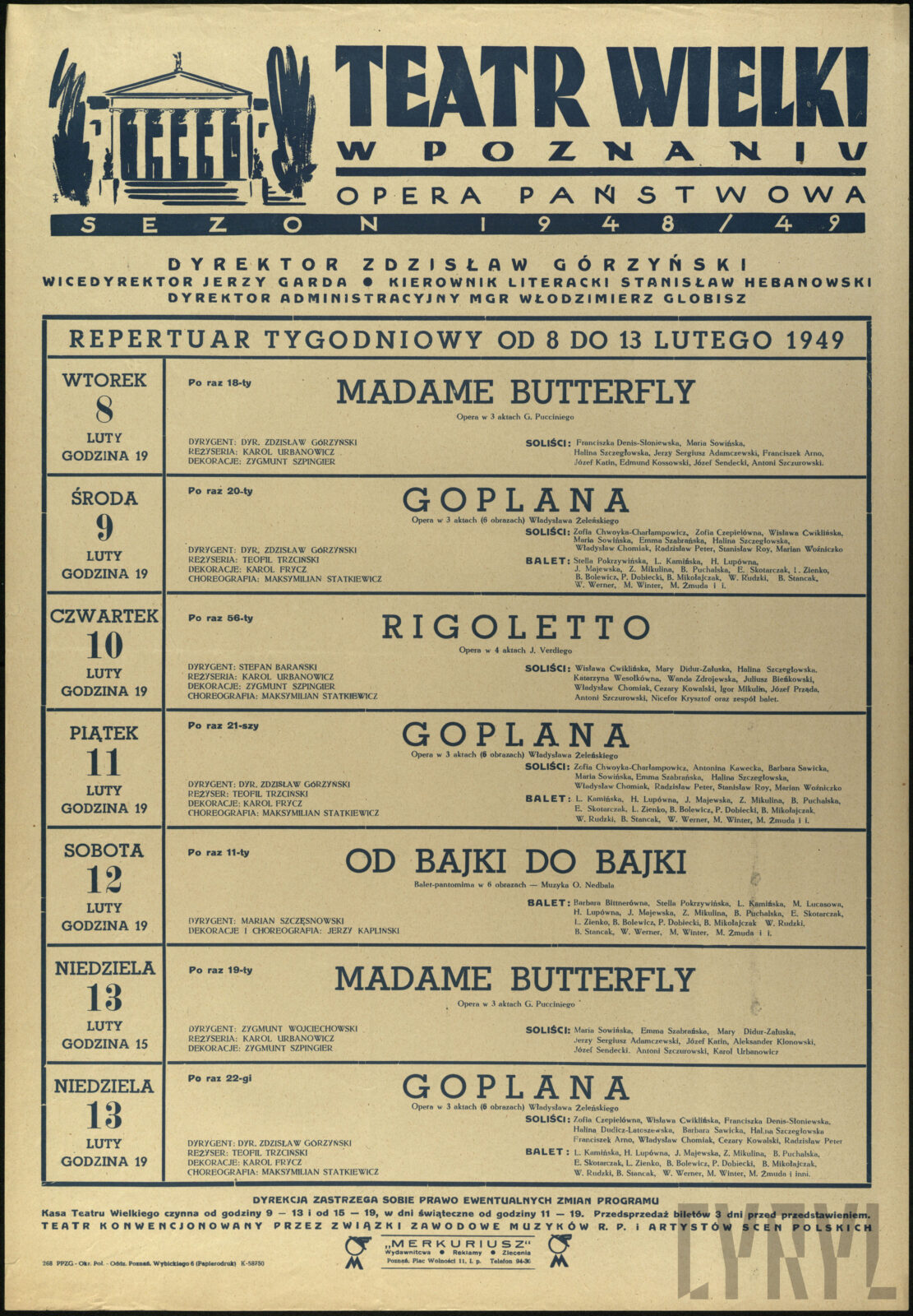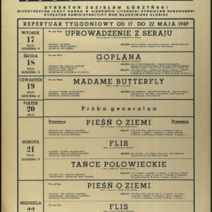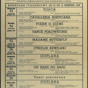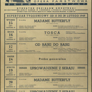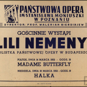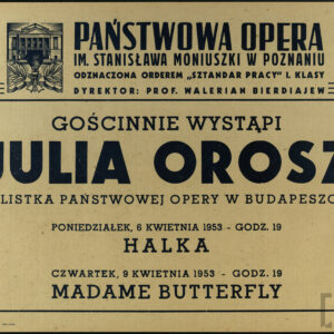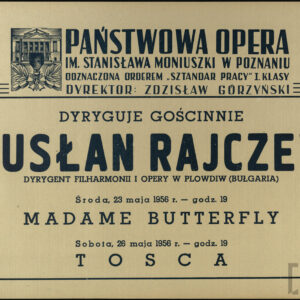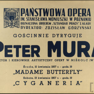 07.04.1957–10.04.1957Afisz spektakli operowych Madame Butterfly i Cyganeria Giacoma Pucciniego z gościnnym udziałem węgierskiego dyrygenta Petera Mury