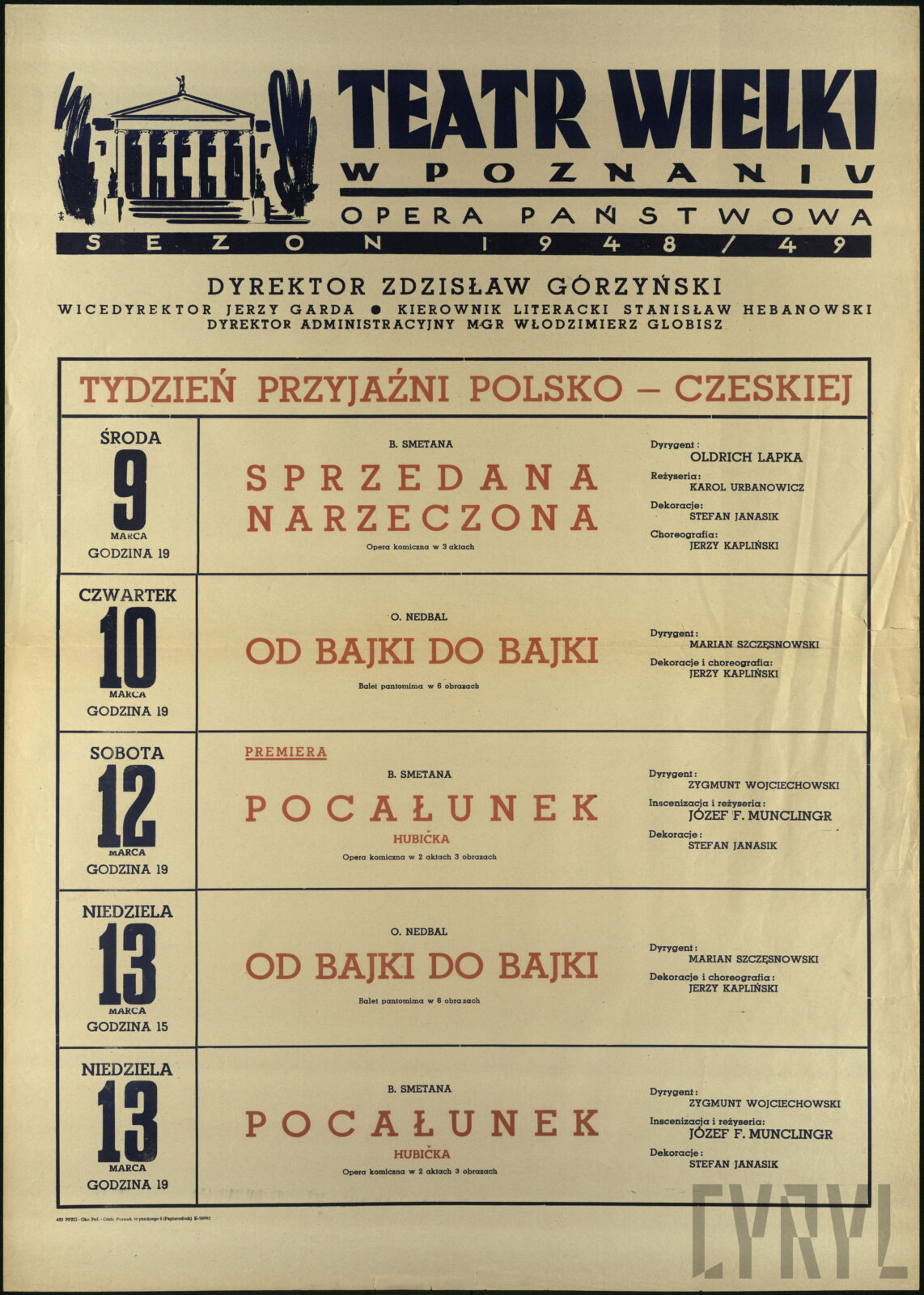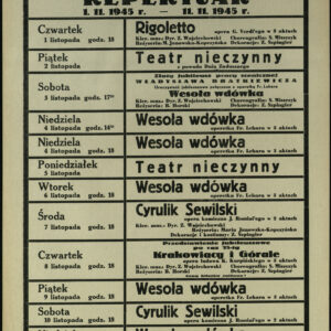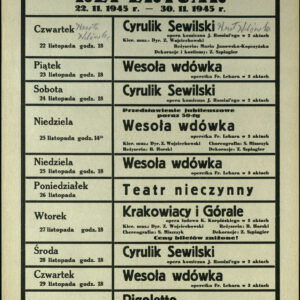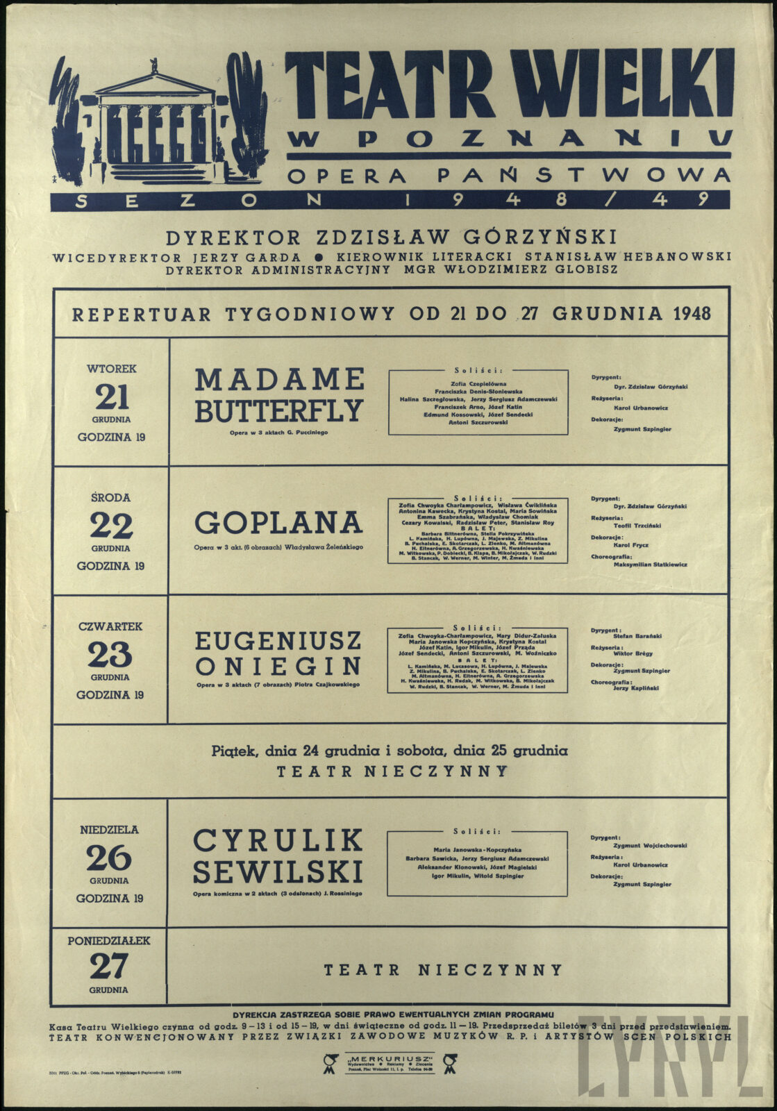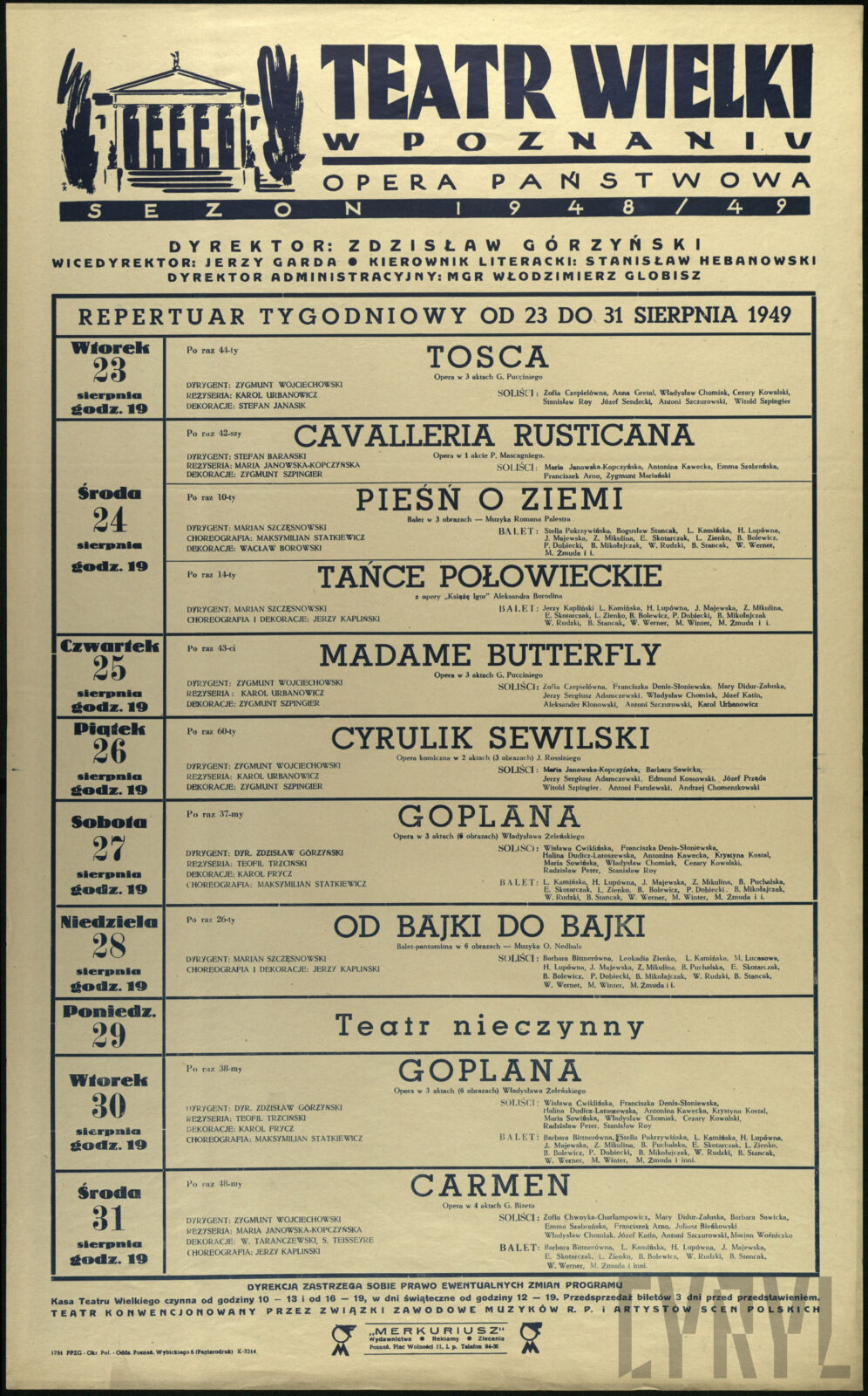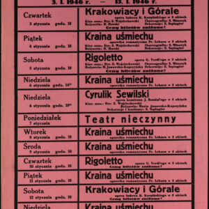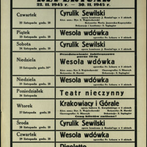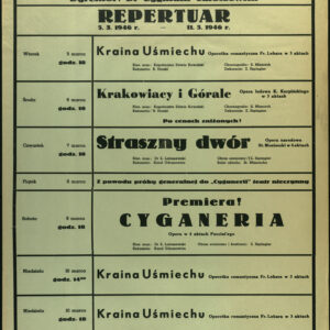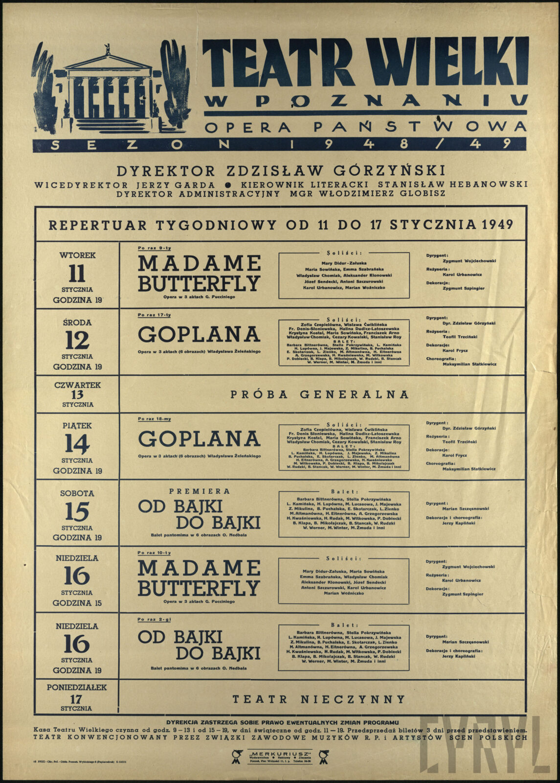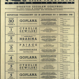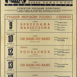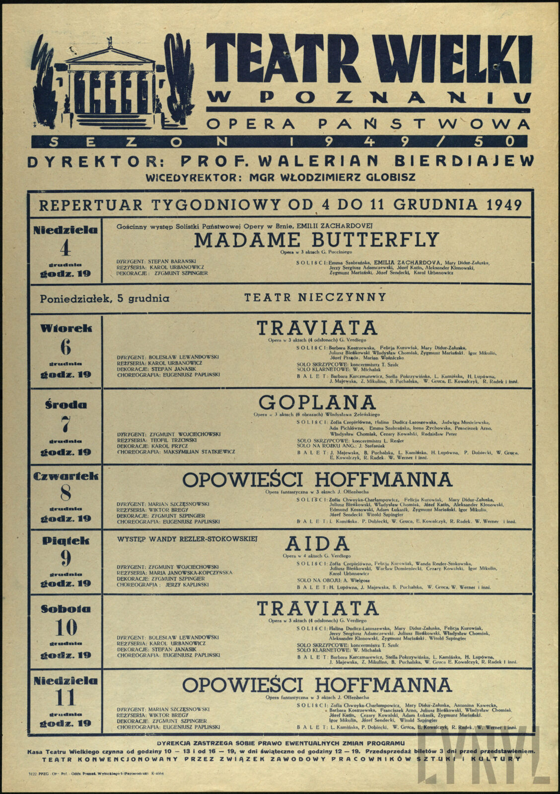 07.04.1957–10.04.1957Afisz spektakli operowych Madame Butterfly i Cyganeria Giacoma Pucciniego z gościnnym udziałem węgierskiego dyrygenta Petera Mury