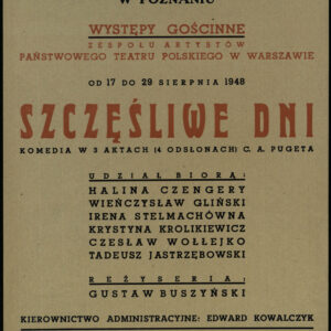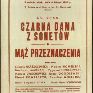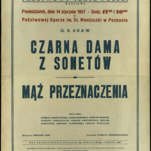 04.02.1957Afisz gościnnych występów artystów Państwowego Teatru Polskiego w spektaklach Czarna dama z sonetów i Mąż przeznaczenia George`a Bernarda Shawa