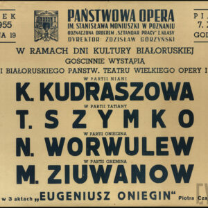 14.01.1957Afisz gościnnego występu białoruskich solistów K. Kudraszowej, T. Szymko, N. Worwulewa, M. Ziuwanowa w spektaklu operowym Eugeniusz Oniegin Piotra Czajkowskiego