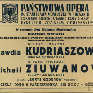 07.02.1957Afisz gościnnego występu białoruskich solistów Kławdii Kudriaszowej i Michaiła Ziuwanowa w spektaklu operowym Borys Godunow Modesta Musorgskiego