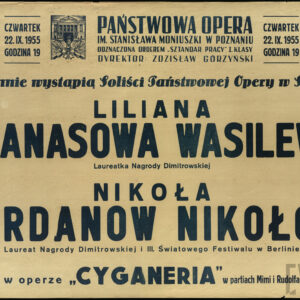 07.10.1955Afisz gościnnego występu solistów Państwowej Opery w Stalino (dzisiaj Donieck) Liliany Atanasowej Wasilewskiej i Nikołaja Jordanowa Nikołowa w spektaklu operowym Cyganeria Giacoma Pucciniego