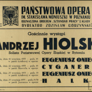 23.09.1955–25.09.1955Afisz gościnnych występów solisty Andrzeja Hiolskiego w spektaklach operowych Eugeniusz Oniegin Piotra Czajkowskiego, Cyganeria Giacoma Pucciniego i Halka Stanisława Moniuszki