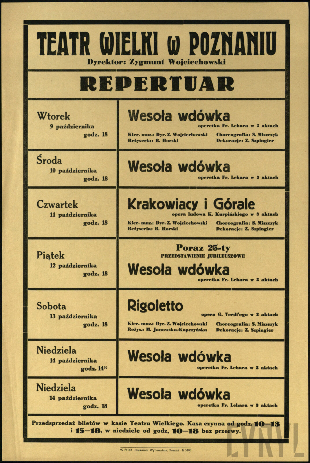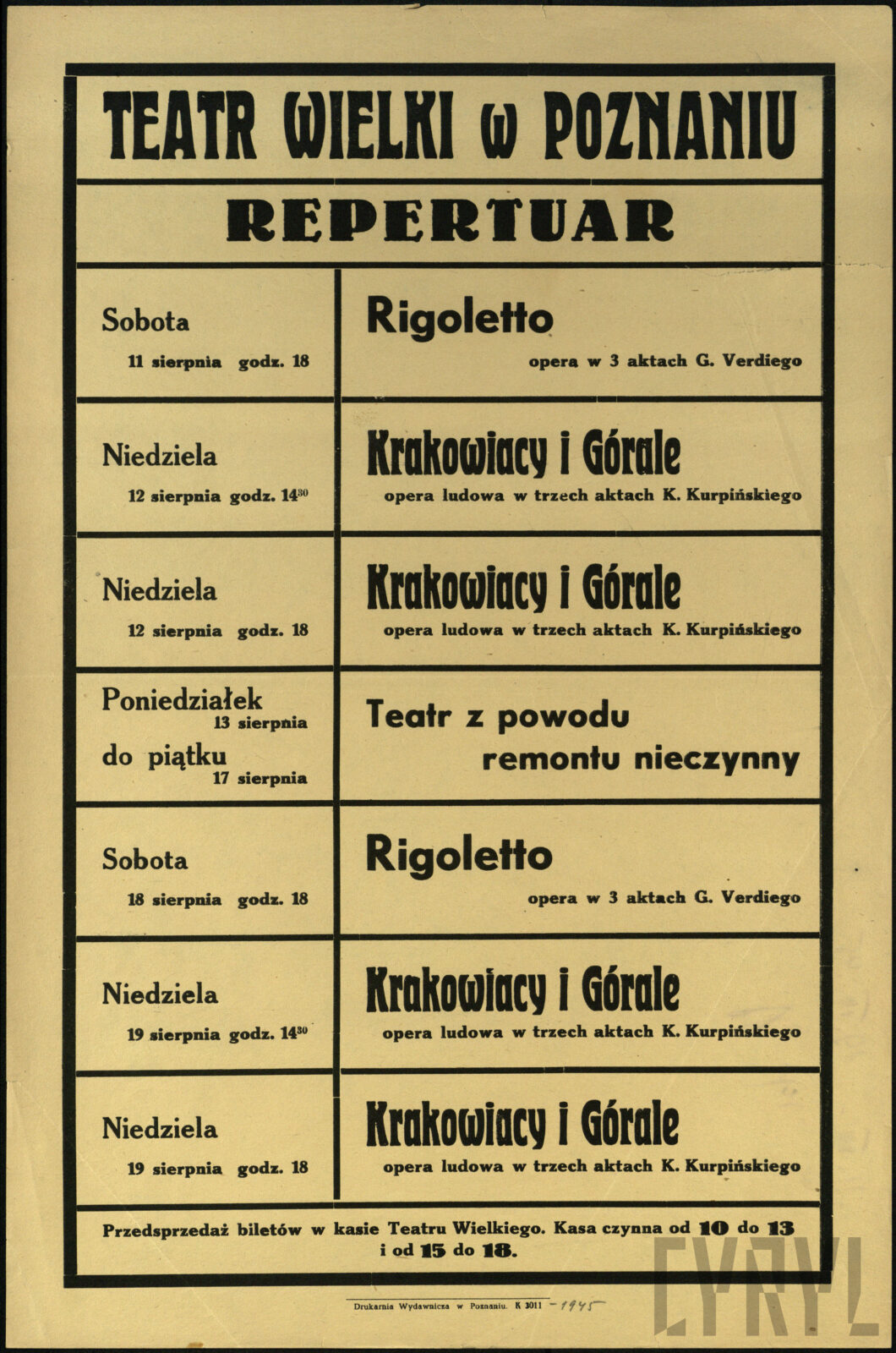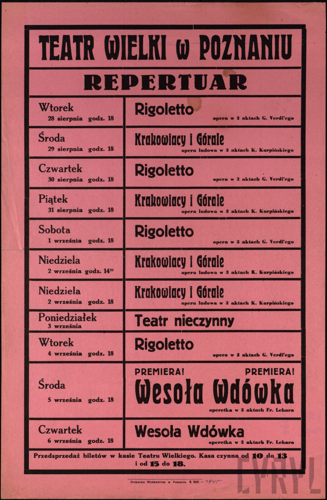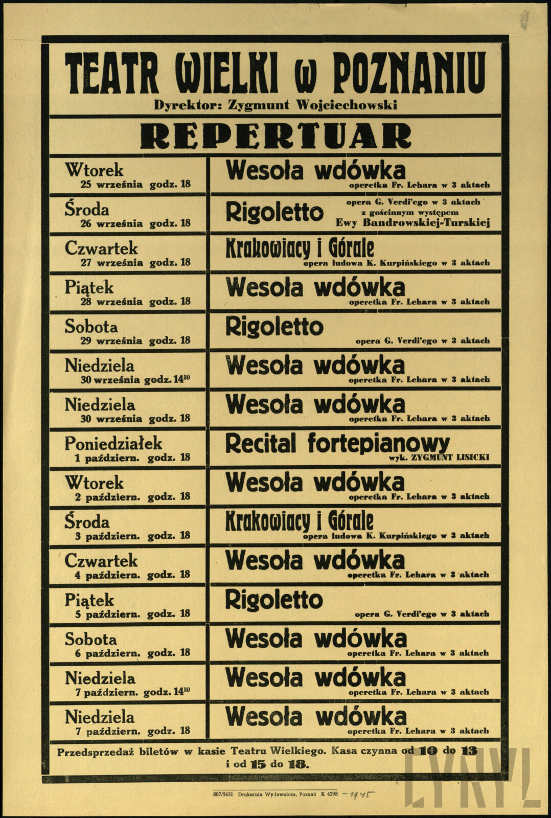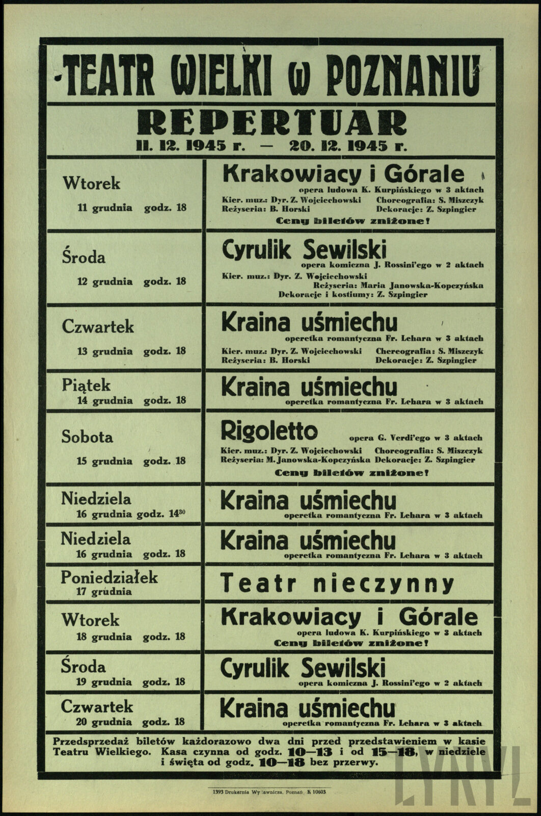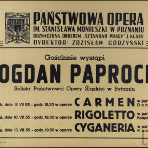18.09.1955–25.09.1955Afisz gościnnego występu Bogdana Paprockiego w spektaklu operowym Carmen Georges’a Bizeta, Rigoletto Giuseppe Verdiego i Cyganerię Giacoma Pucciniego