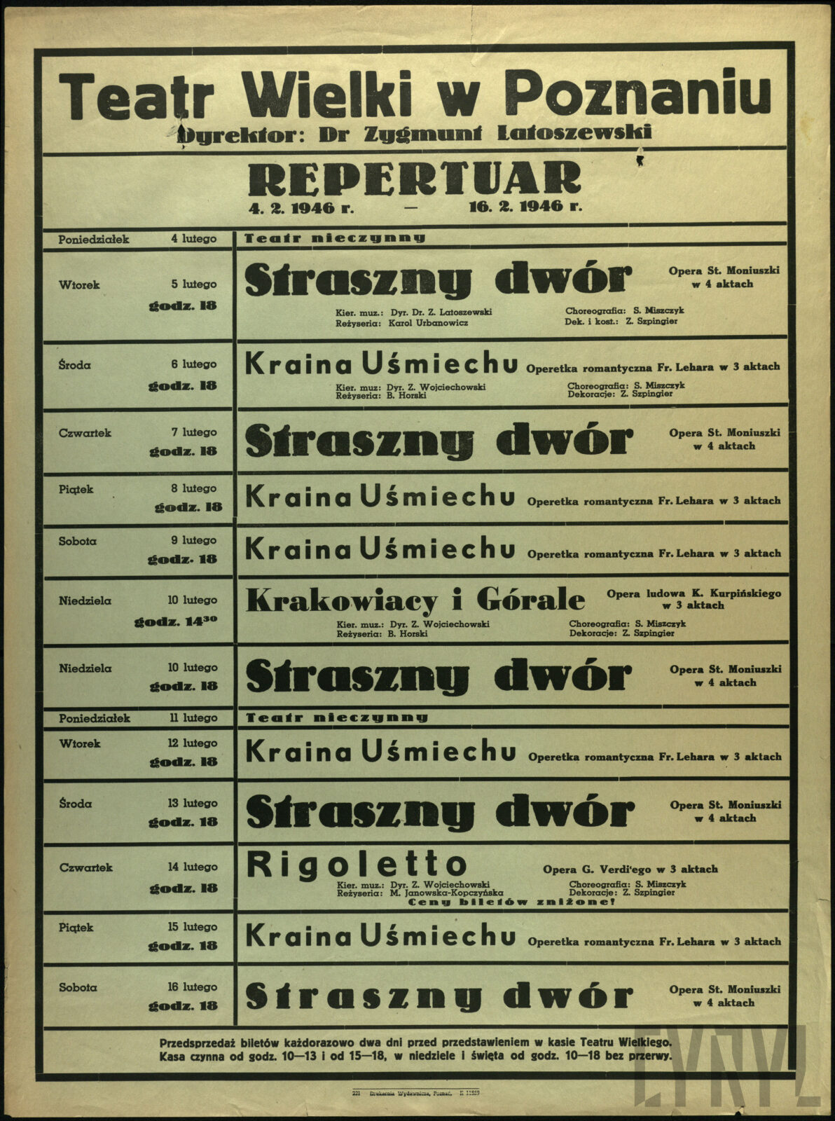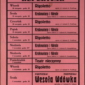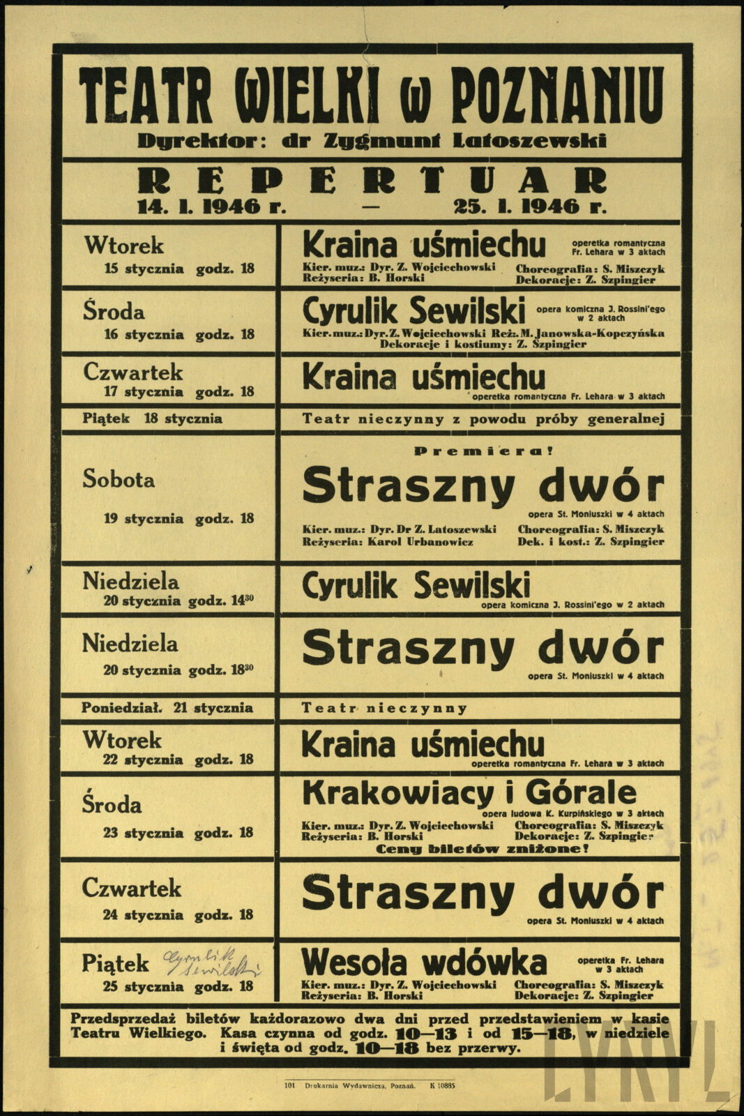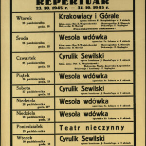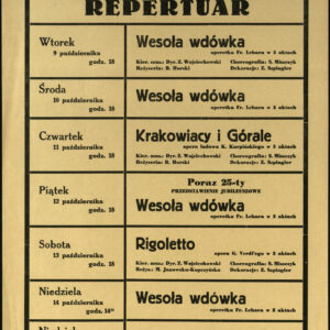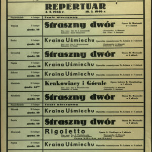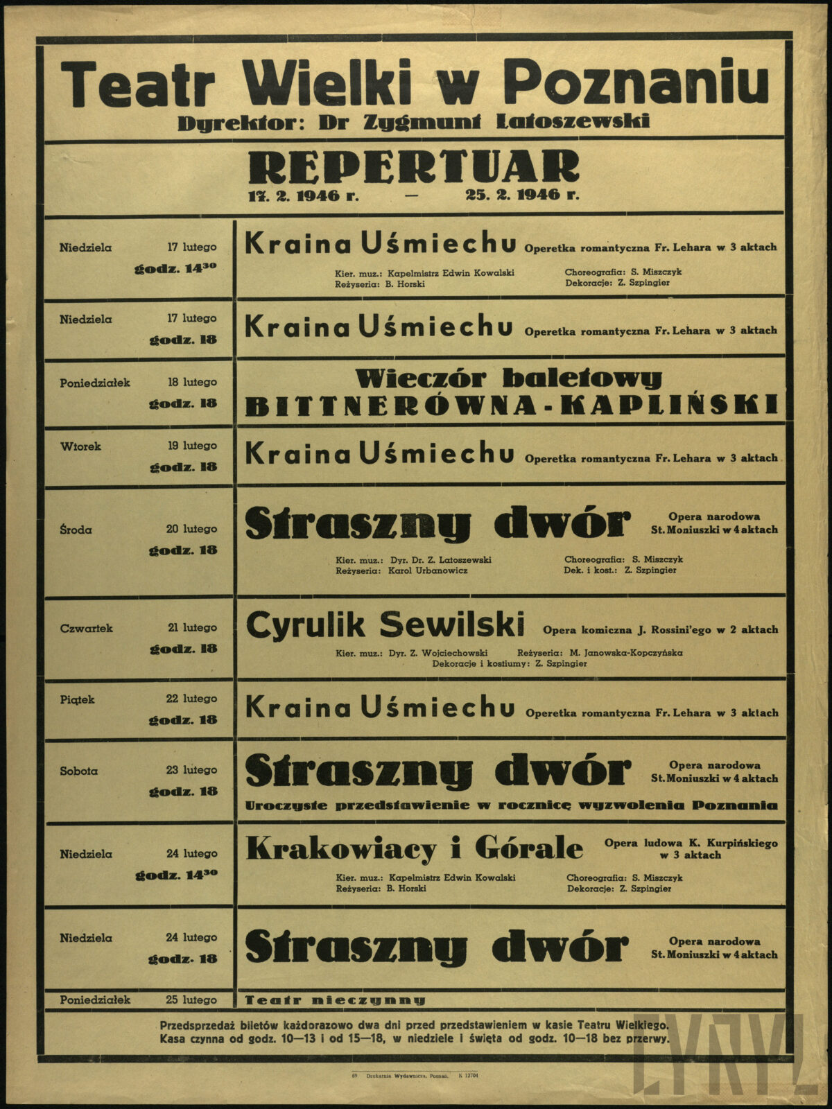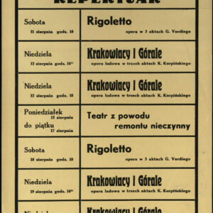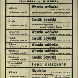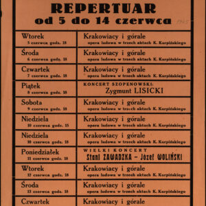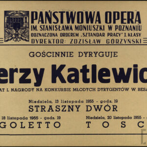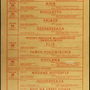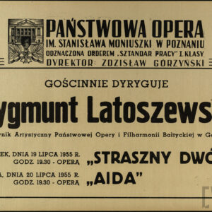 16.07.1955Afisz spektakli operowych Straszny dwór Stanisława Moniuszki i Aida Giuseppe Verdiego z gościnnym udziałem dyrygenta Zygmunta Latoszewskiego