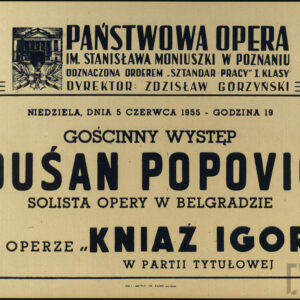 19.07.1955–20.07.1955Afisz gościnnego występu serbskiej solistki Duśan Popović w spektaklu operowym Kniaź Igor Aleksandra Borodina