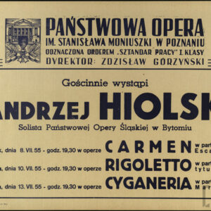 05.06.1955Afisz gościnnego występu Andrzeja Hiolskiego w spektaklach operowych Carmen Georges’a Bizeta, Rigoletto Giuseppe Verdiego i Cyganeria Giacoma Pucciniego