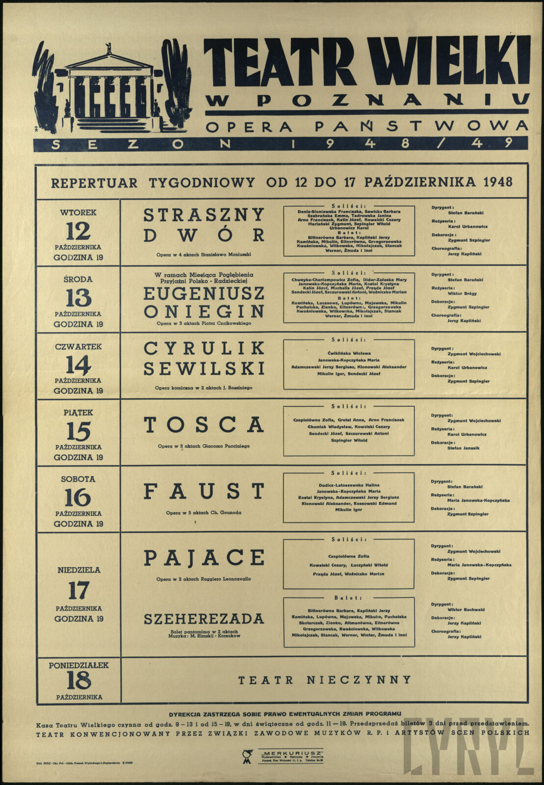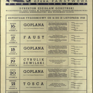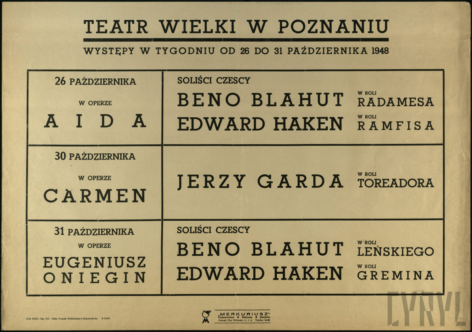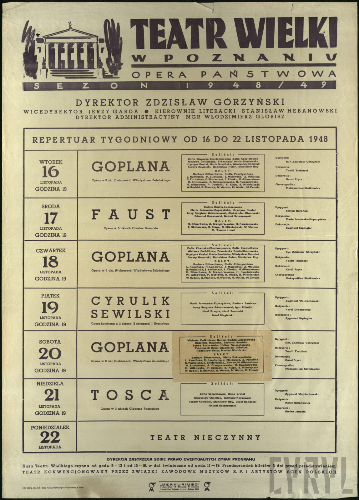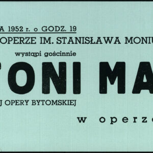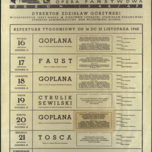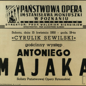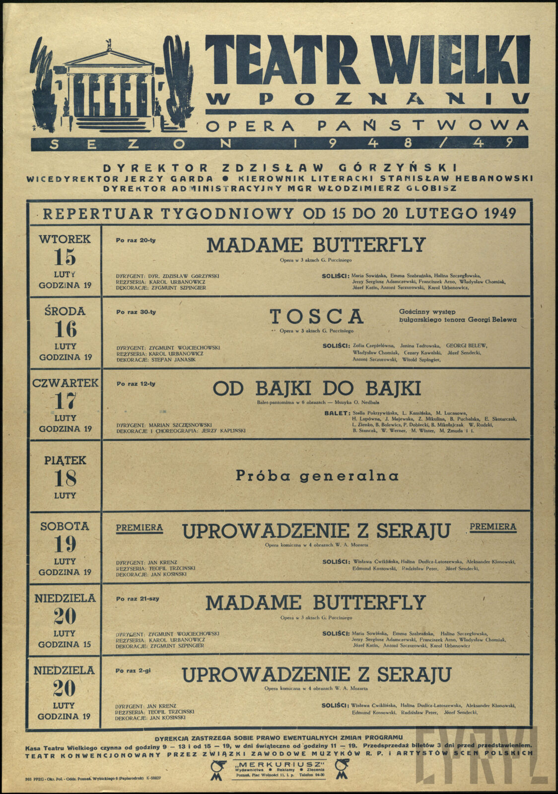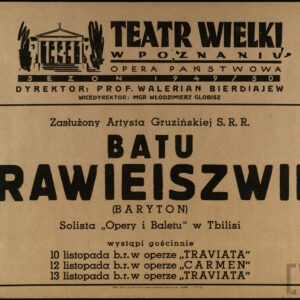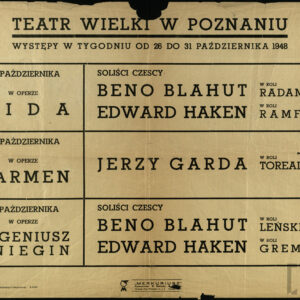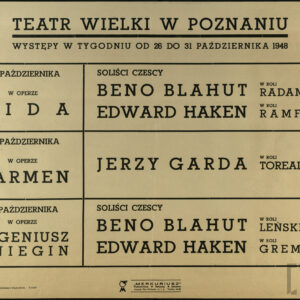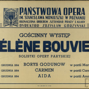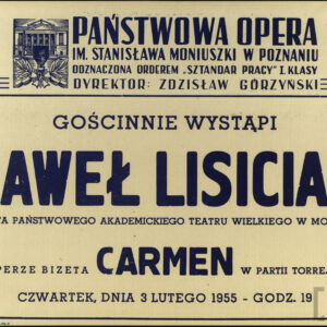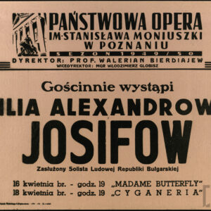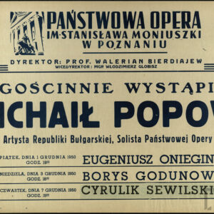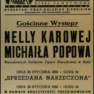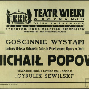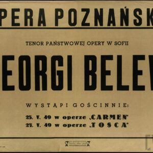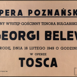 11.02.1950Afisz gościnnych występów bułgarskiego solisty Georgia Belewa w spektaklach operowych Carmen Georges’a Bizeta i Tosca Giacoma Pucciniego na deskach Opery poznańskiej