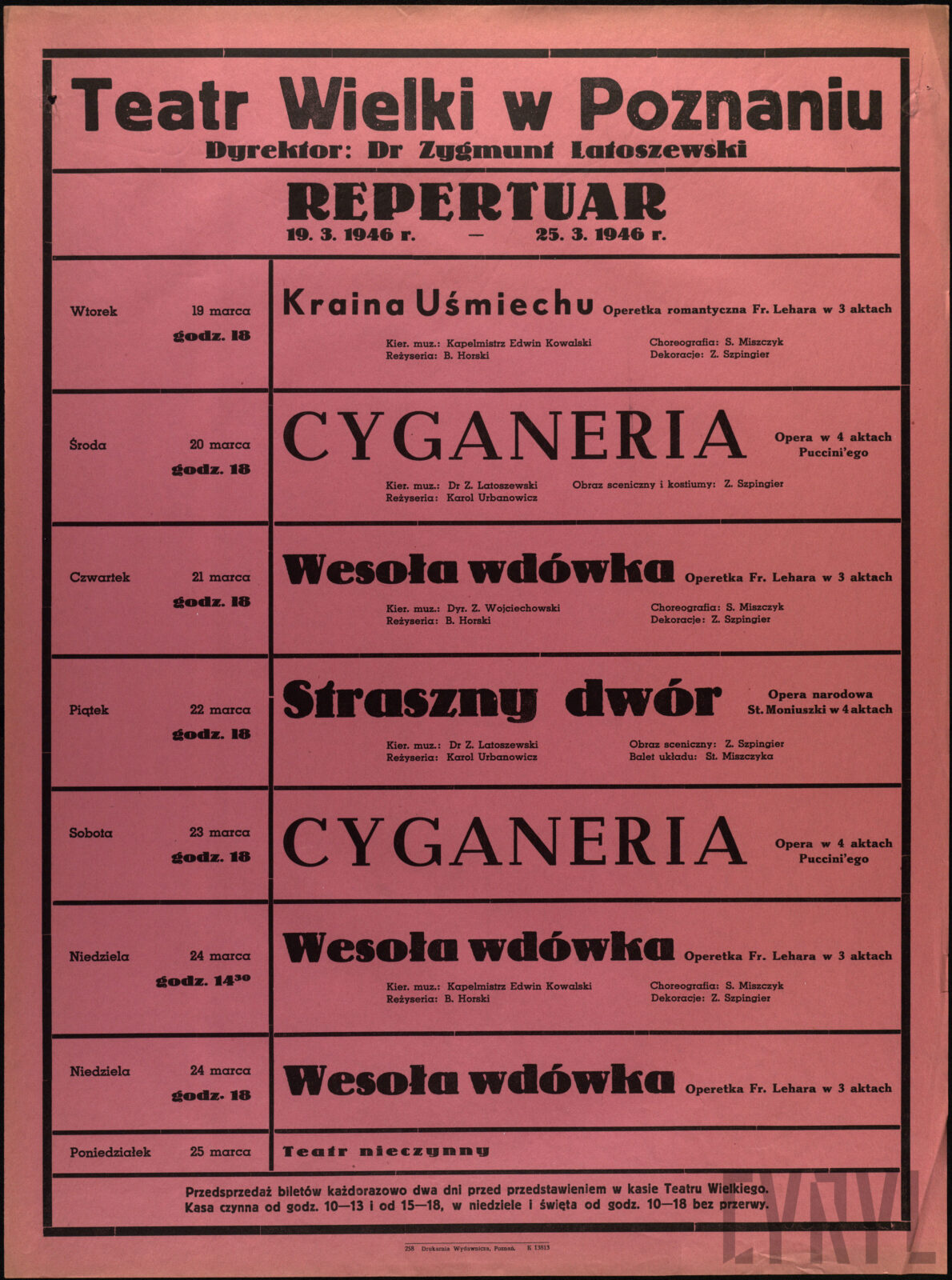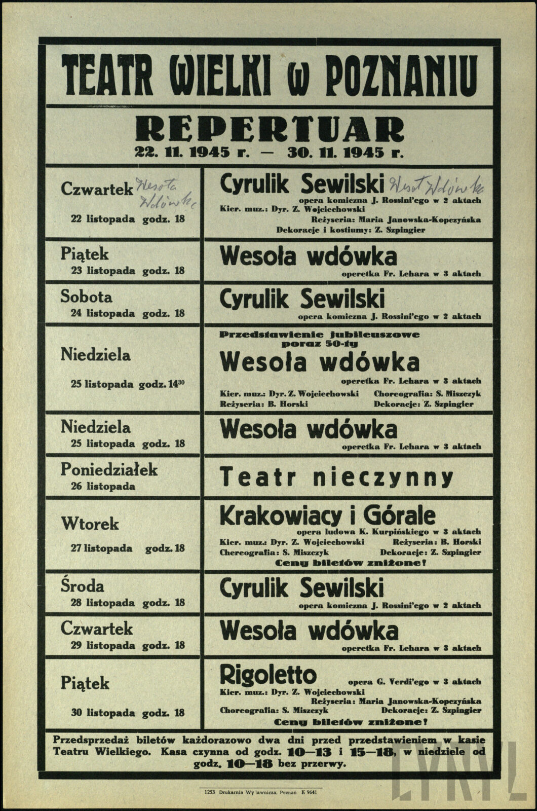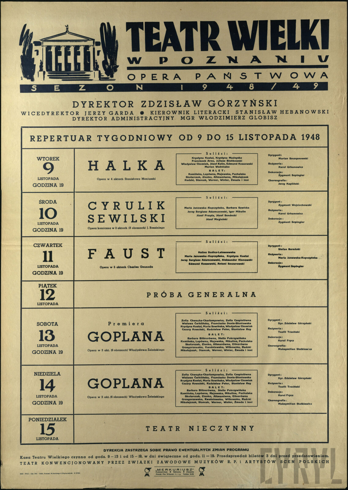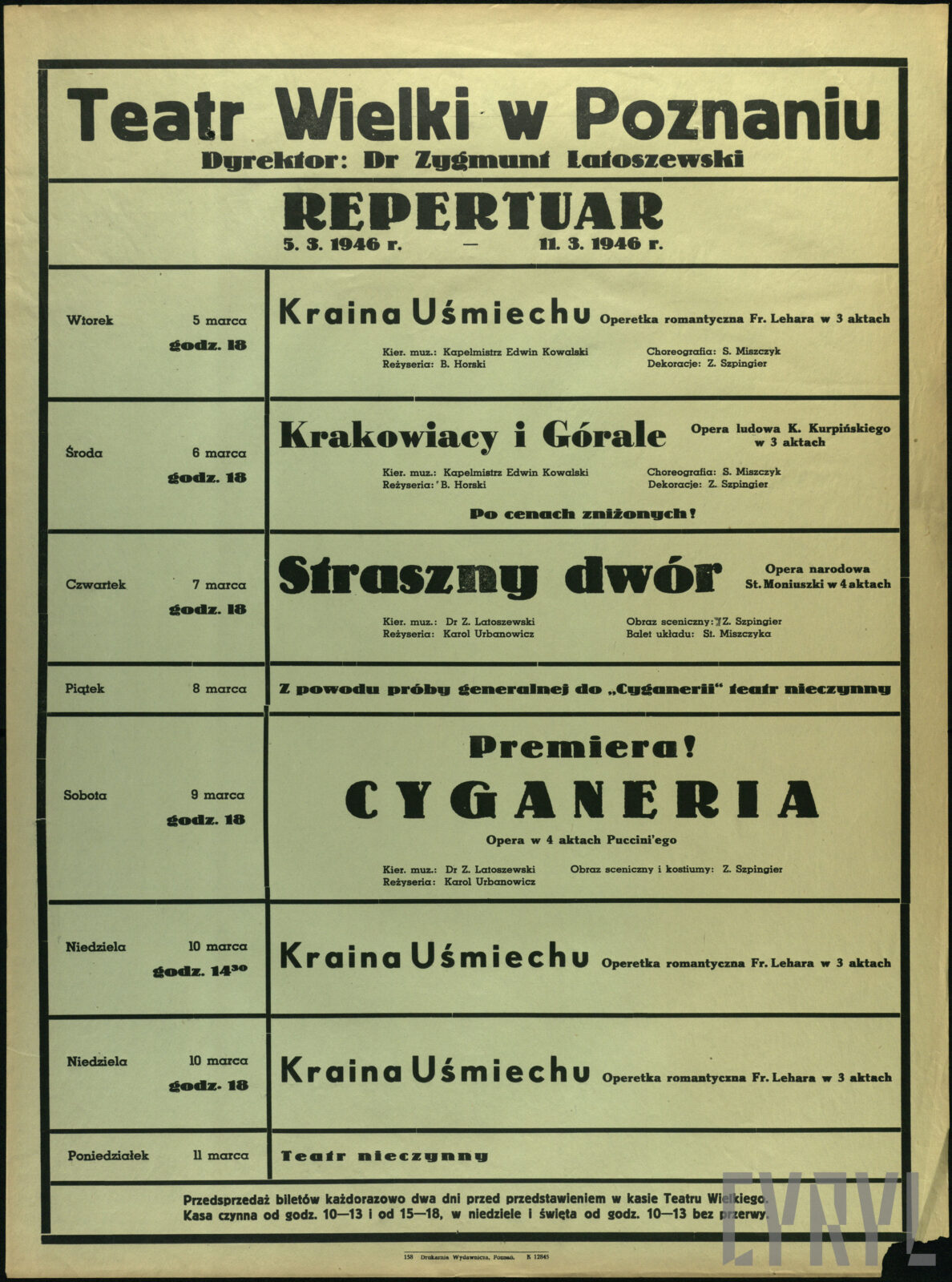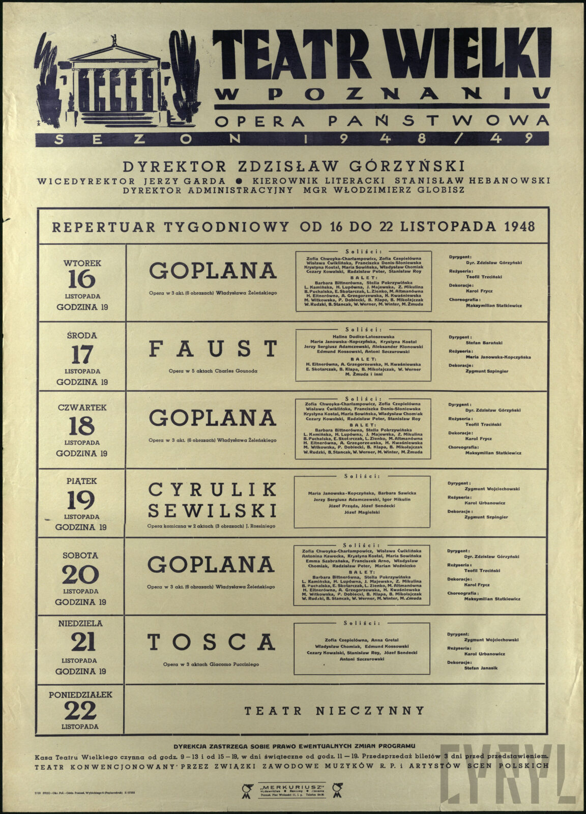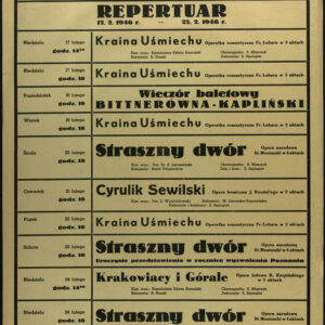 11.02.1950Afisz gościnnych występów bułgarskiego solisty Georgia Belewa w spektaklach operowych Carmen Georges’a Bizeta i Tosca Giacoma Pucciniego na deskach Opery poznańskiej