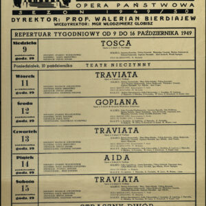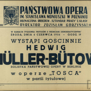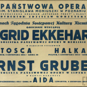 09.10.1955Afisz występów gościnnych niemieckich solistów Sigrid Ekkehard i Ernsta Grubera w spektaklach operowych Tosca Giacoma Pucciniego, Halka Stanisława Moniuszki i Aida Giuseppe Verdiego