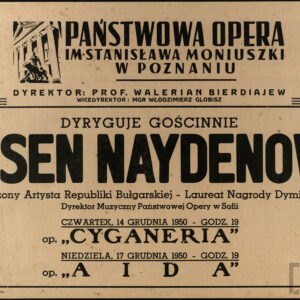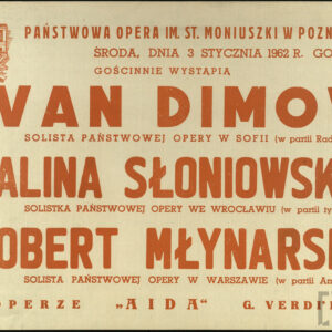05.01.1962Afisz gościnnego występu bułgarskich i polskich solistów Ivana Dimova, Haliny Słoniowskiej i Roberta Młynarskiego w spektaklu operowym Aida Giuseppe Verdiego