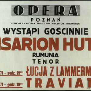 28.09.1971Afisz gościnnych występów rumuńskiego solisty Visariona Hutu w spektaklach operowych Łucja z Lammermoor Gaetana Donizettiego i Traviata Giuseppe Verdiego