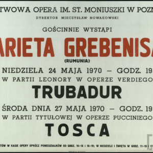 29.08.1970–30.08.1970Afisz gościnnych występów rumuńskiej solistki Mariety Grebenisan w spektaklach operowych Trubadur Giuseppe Verdiego i Tosca Giacoma Pucciniego