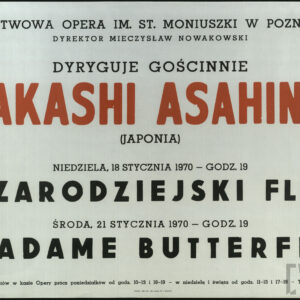 12.03.1970Afisz spektakli Czarodziejski flet Wolfganga Amadeusa Mozarta i Madame Butterfly Giacoma Pucciniego z gościnnym udziałem dyrygenta Takashiego Asahina
