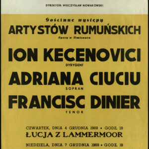 18.01.1970–21.01.1970Afisz gościnnych występów rumuńskich artystów Adriany Ciuciu i Francisca Diniera w spektaklach operowych Łucja z Lammermooru Gaetana Donizettiego i Cyganeria Giacoma Pucciniego