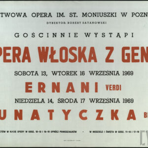 13.09.1969–16.09.1969Afisz gościnnych występów artystów Opery włoskiej z Genui w spektaklach operowych Ernani Giuseppe Verdiego i Lunatyczka Vincenzo Belliniego