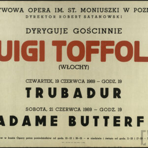 13.09.1969–17.09.1969Afisz spektakli operowych Trubadur Giuseppe Verdiego i Madame Butterfly Giacoma Pucciniego z gościnnym udziałem włoskiego dyrygenta Luigiego Toffolo