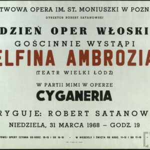 03.04.1968Afisz gościnnego występu solistki Delfiny Ambroziak w spektaklu operowym Cyganeria Giacoma Pucciniego pod batutą Roberta Satanowskiego