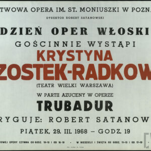 30.03.1968Afisz gościnnego występu Krystyny Szostek-Radkowej w spektaklu operowym Trubadur Giuseppe Verdiego pod batutą Roberta Satanowskiego