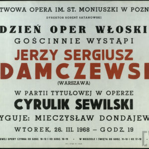27.03.1968Afisze gościnnego występu solisty Jerzego Sergiusza Adamczewskiego w spektaklu operowym Cyrulik sewilski Gioacchina Rossiniego pod batutą Mieczysława Dondajewskiego
