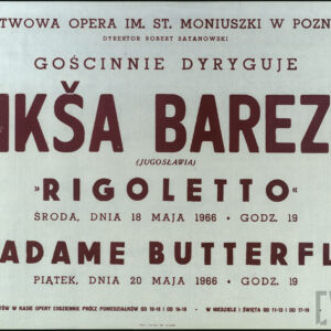 28.05.1966Afisz spektakli operowych Rigoletto Giuseppe Verdiego i Madame Butterfly Giacoma Pucciniego z gościnnym udziałem dyrygenta z Jugosławii Nikša Bareza