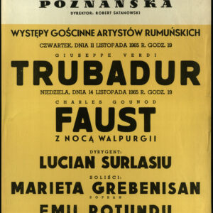 02.12.1965Afisz gościnnych występów rumuńskich artystów Marinety Grebenisany i Emila Rotunda w spektaklach operowych Trubatur Giuseppe Verdiego, Faust Charles’a Gounoda pod batutą Luciana Surlasia