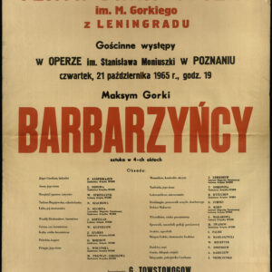 11.11.1965–14.11.1965Afisz gościnnego występu artystów Akademickiego Teatru Dramatycznego im. Maksyma Gorkiego w Leningradzie (dzisiaj Petersburg) w spektaklu Barbarzyńcy Maksyma Gorkiego