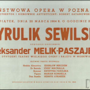 22.03.1964Afisz spektaklu operowego Cyrulika sewilskiego Gioacchina Rossiniego z gościnnym udziałem rosyjskiego dyrygenta Aleksandra Melika-Paszajewskiego