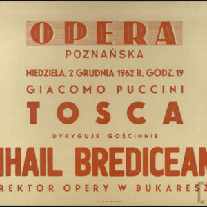 18.01.1963Afisz spektaklu Tosca Giacoma Pucciniego z gościnnym udziałem rumuńskiego dyrygenta Mihaila Brediceanu
