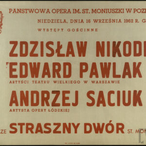 18.09.1962Afisz gościnnych występów solistów Zdzisława Nikodema, Edwarda Pawlaka i Andrzeja Saciuka w spektaklu operowym Straszny dwór Stanisława Moniuszki