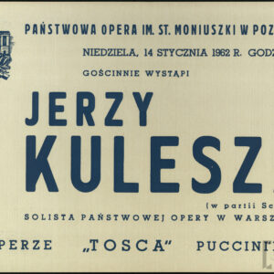 18.01.1962–20.01.1962Afisz gościnnego występu solisty Jerzego Kuleszy w spektaklu operowym Tosca Giacoma Pucciniego