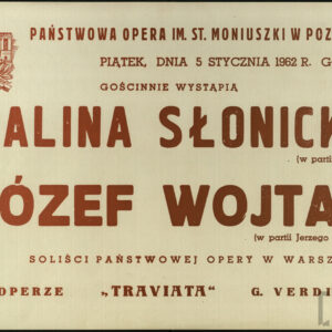 14.01.1962Afisz gościnnego występu solistów Haliny Słonickiej i Józefa Wojtana w spektaklu operowym Traviata Giuseppe Verdiego