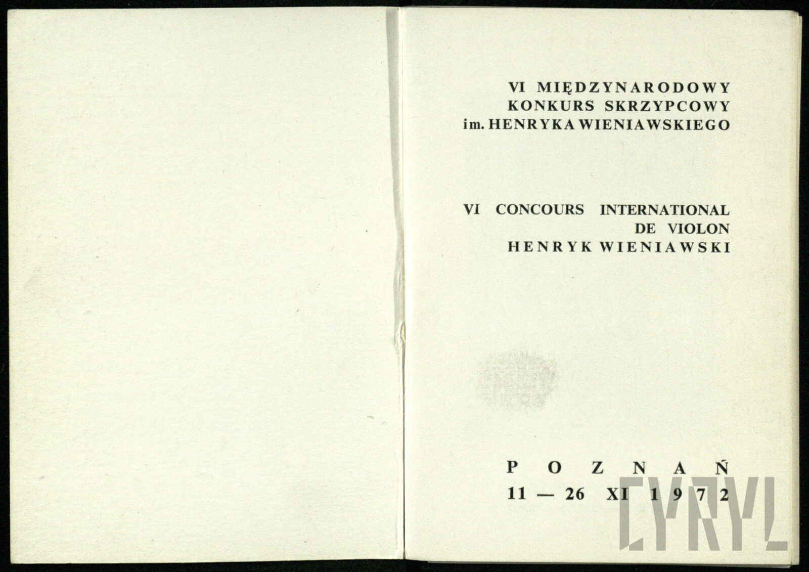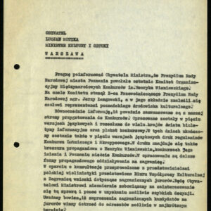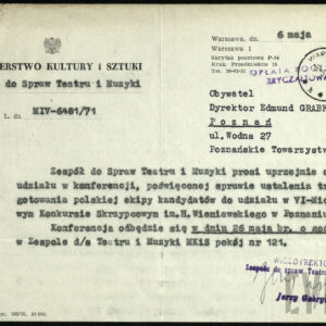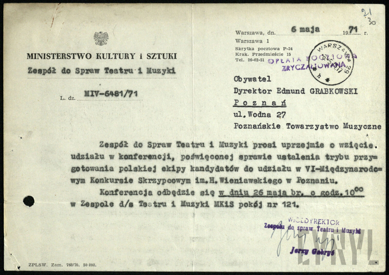 Zaproszenie na konferencję poświęconą przygotowaniu polskiej ekipy kandydatów do udziału w VI Międzynarodowym Konkursie Skrzypcowym im. Henryka Wieniawskiego06.05.1971