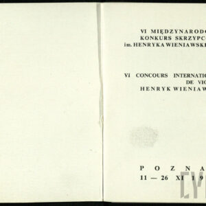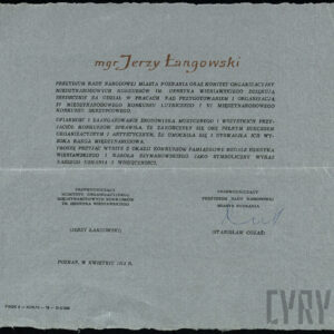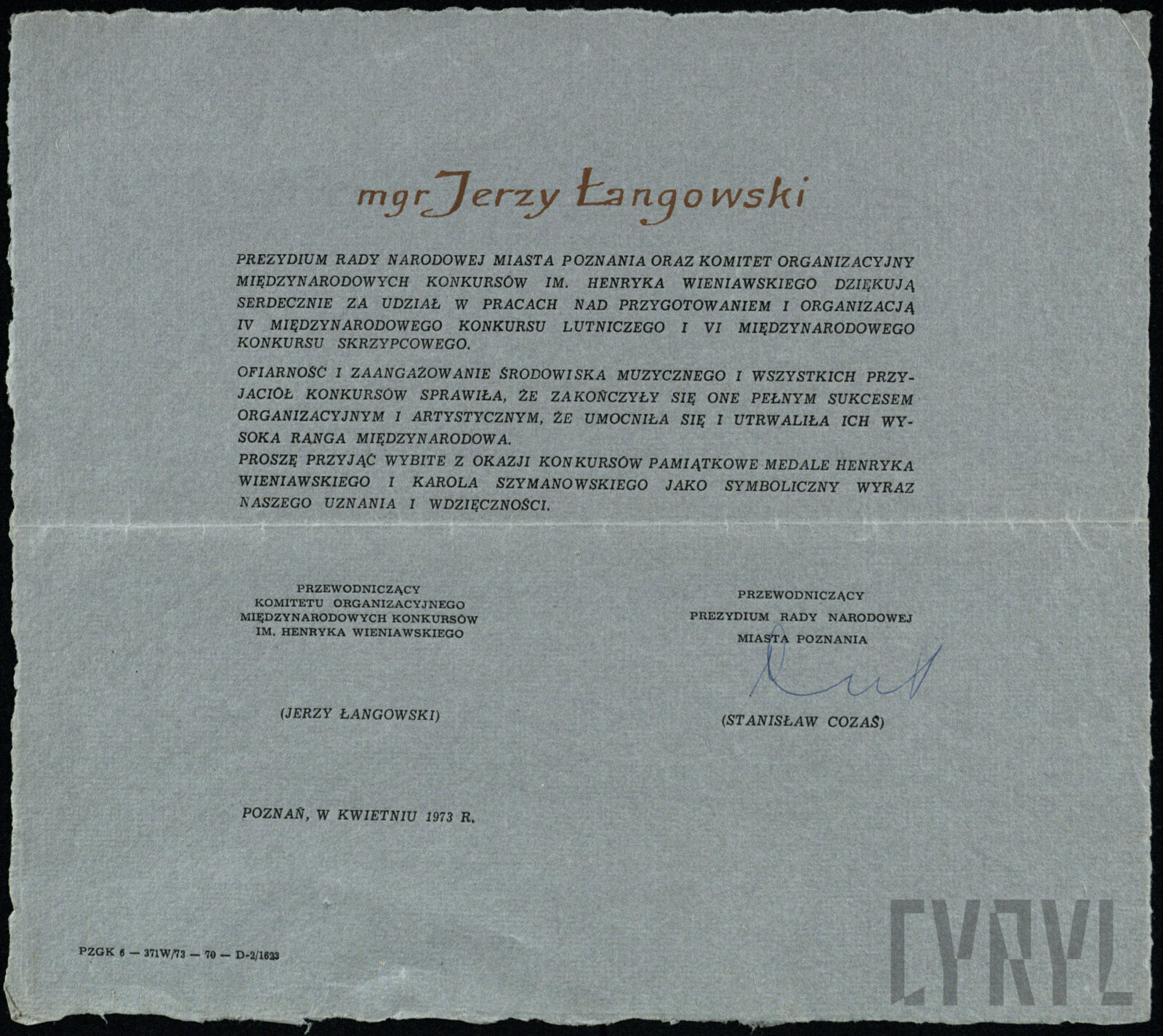 Podziękowania dla Jerzego Łangowskiego za udział w pracach nad przygotowaniem i organizacją IV Międzynarodowego Konkursu Lutniczego i VI Międzynarodowego Konkursu Skrzypcowego im. Henryka Wieniawskiego04.1973