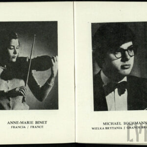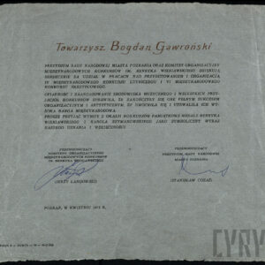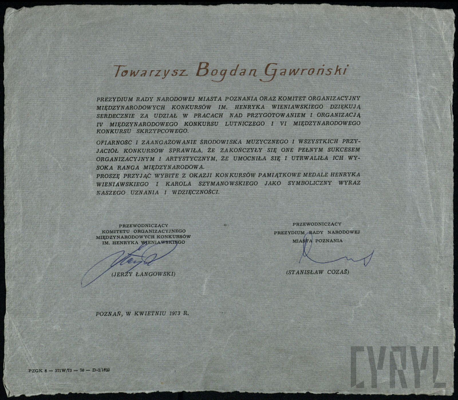 Podziękowania dla Bogdana Gawrońskiego za udział w pracach nad przygotowaniem i organizacją IV Międzynarodowego Konkursu Lutniczego i VI Międzynarodowego Konkursu Skrzypcowego im. Henryka Wieniawskiego04.1973
