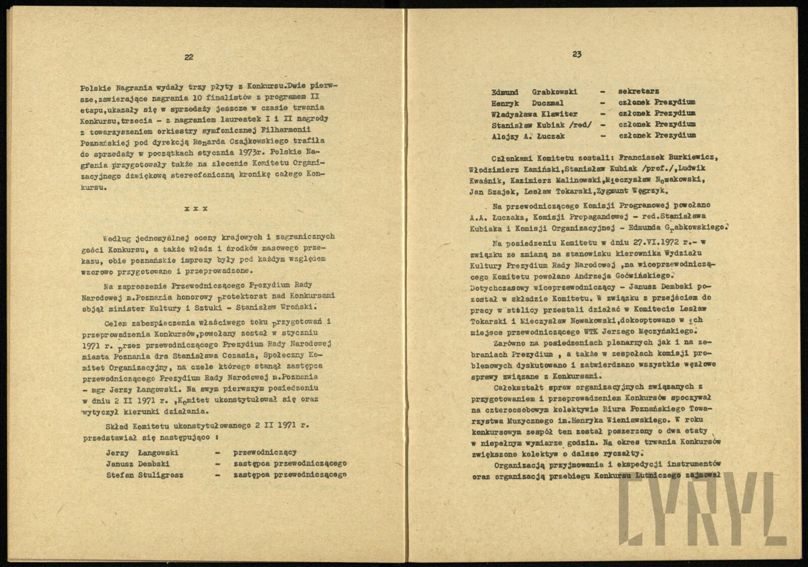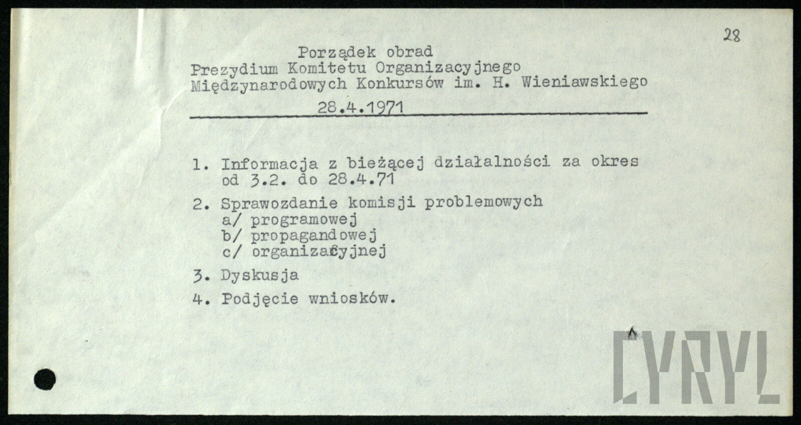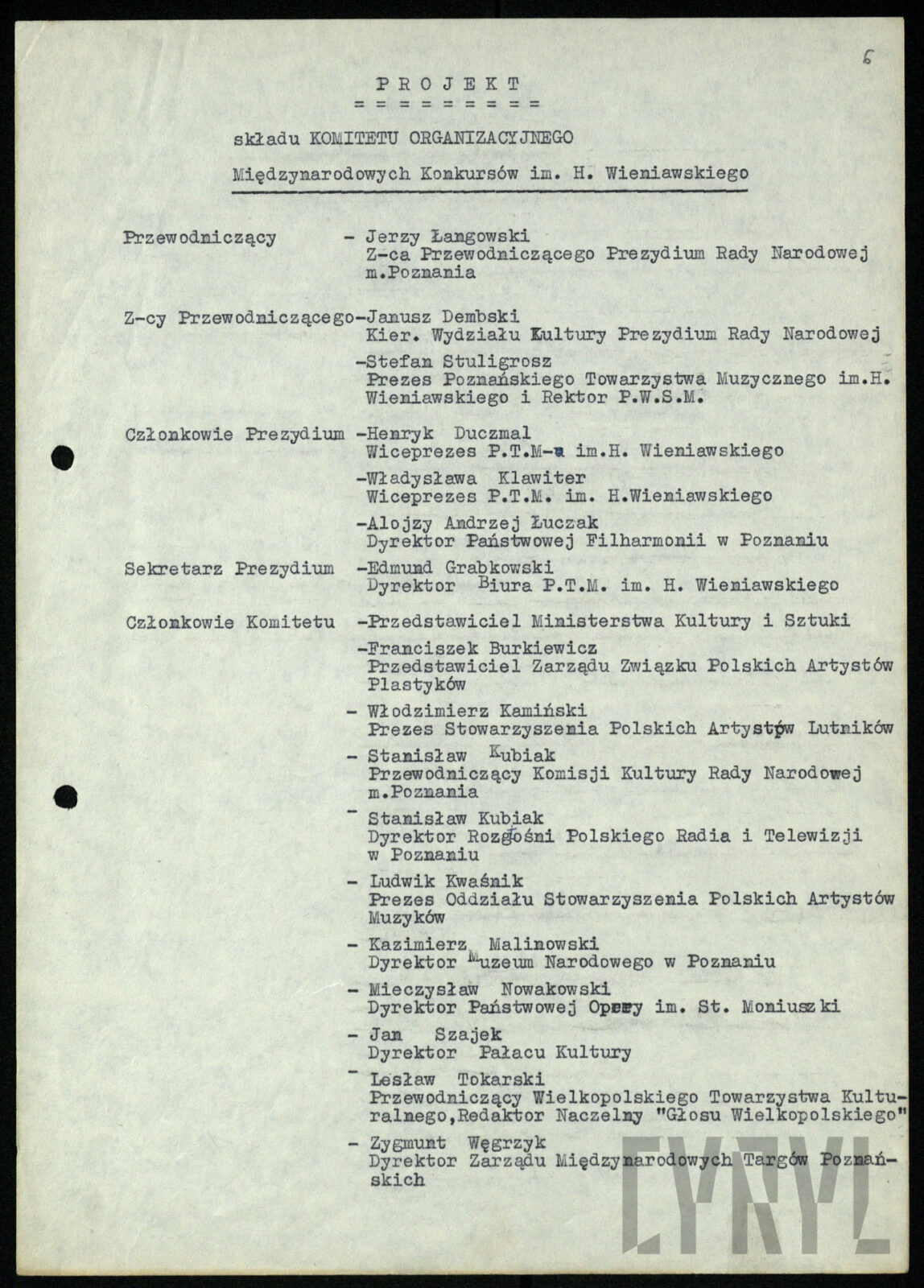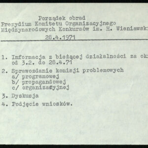 Informacja o powołaniu Komitetu Organizacyjnego Międzynarodowych Konkursów im. Henryka Wieniawskiego (lutniczego i skrzypcowego) i jego składzie oraz pracach związanych z organizacją konkursów29.01.1971