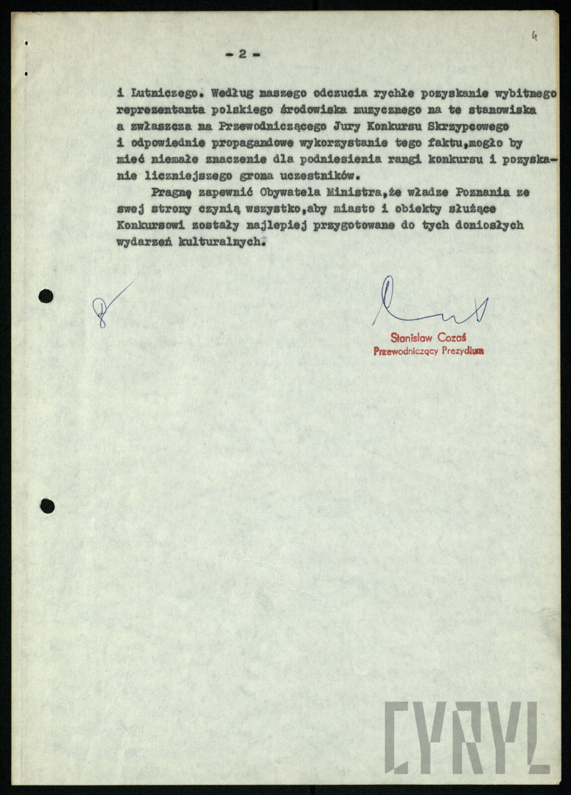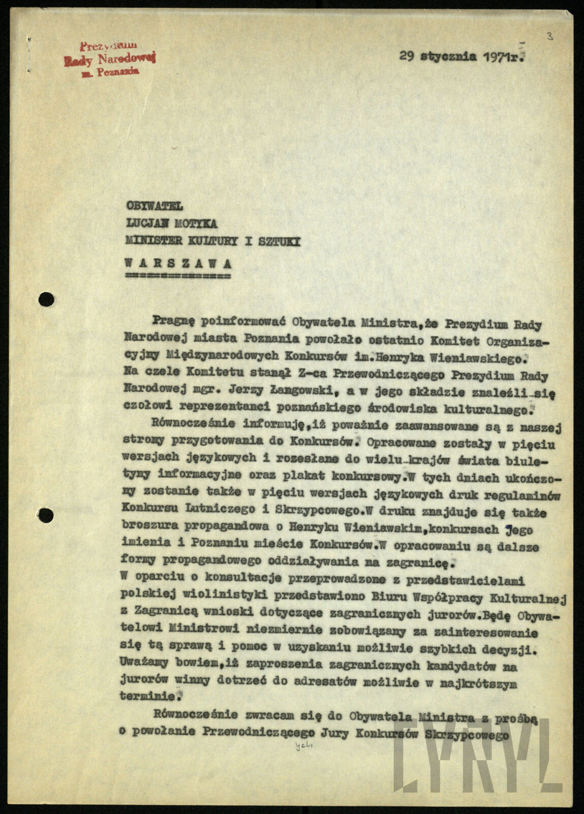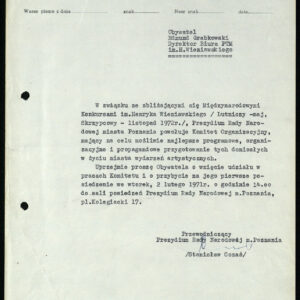 Prośba o wzięcie udziału w pracach Komitetu Organizacyjnego Międzynarodowych Konkursów im. Henryka Wieniawskiego (lutniczego i skrzypcowego) skierowana do Edmunda Grabkowskiego18.01.1971