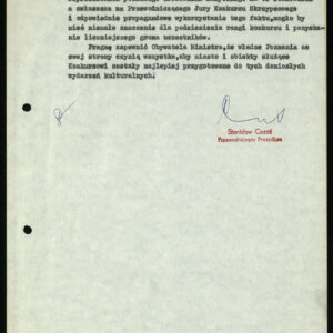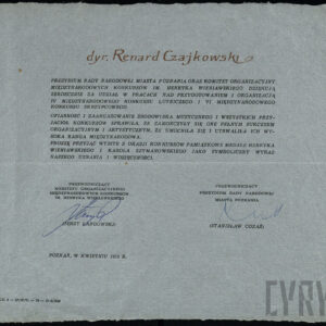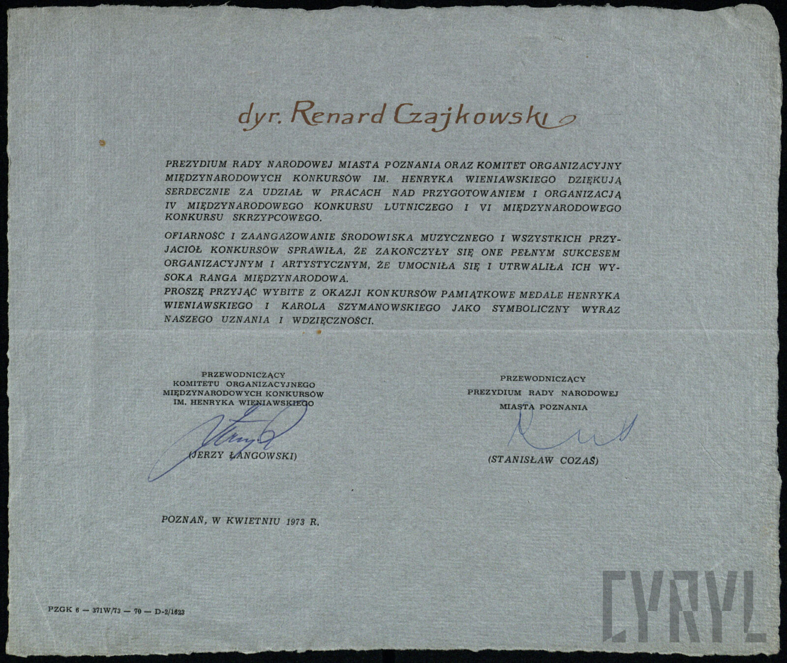 Podziękowania dla Renarda Czajkowskiego za udział w pracach nad przygotowaniem i organizacją IV Międzynarodowego Konkursu Lutniczego i VI Międzynarodowego Konkursu Skrzypcowego im. Henryka Wieniawskiego04.1973