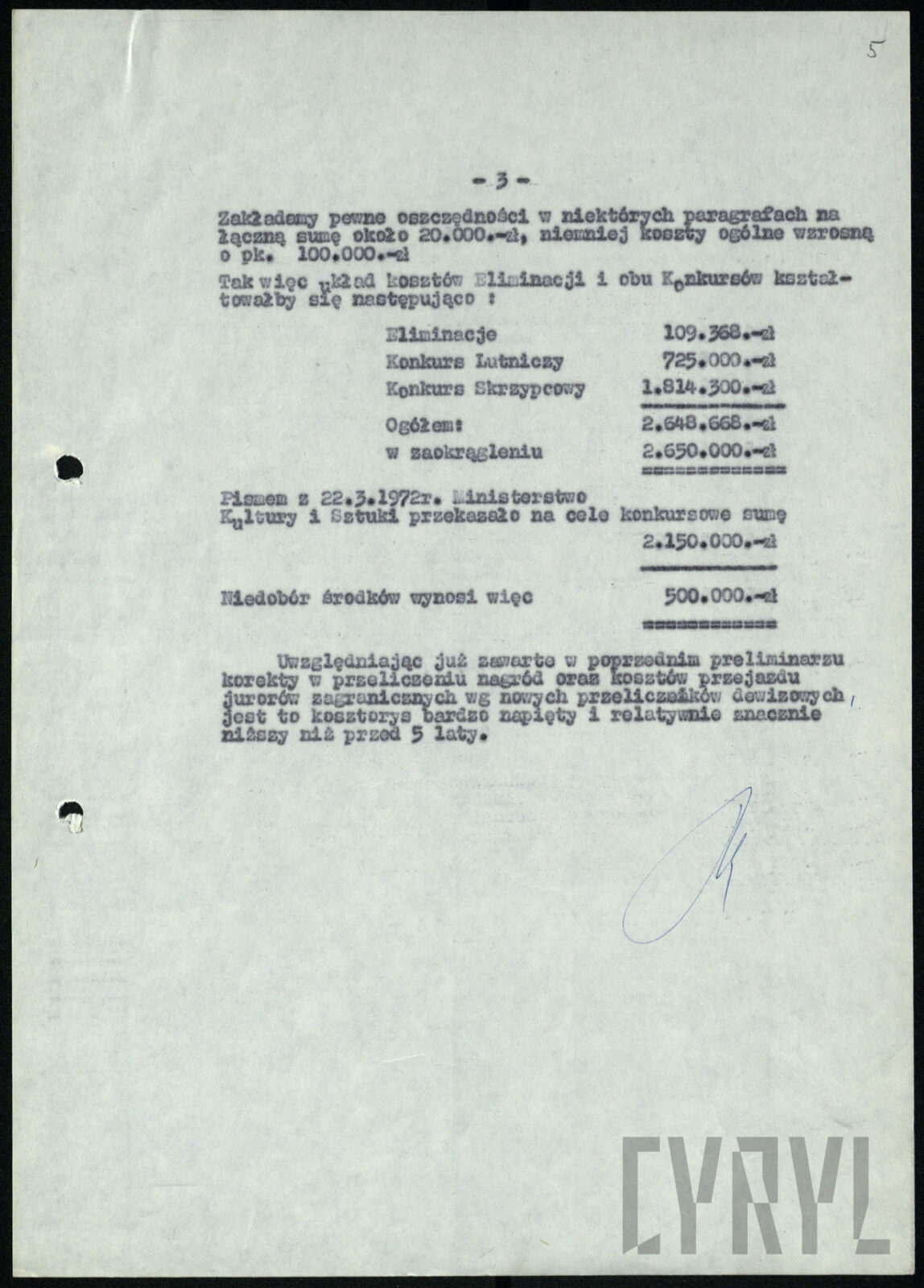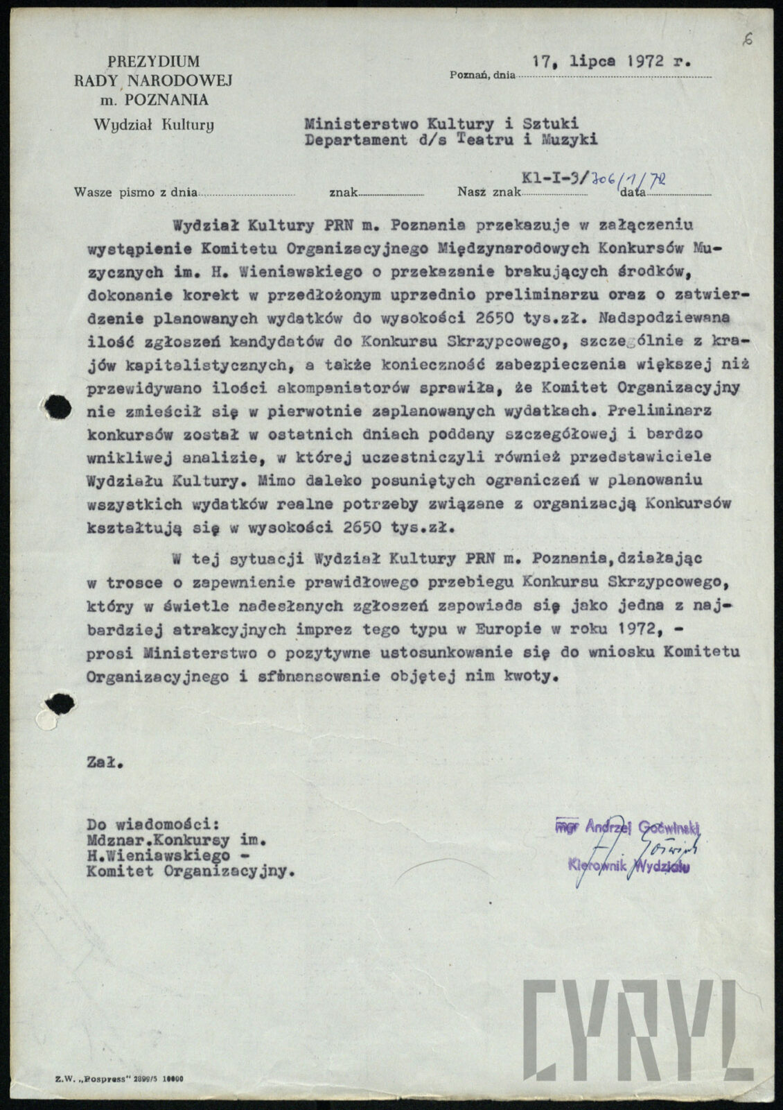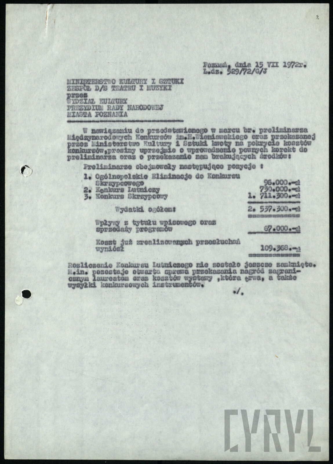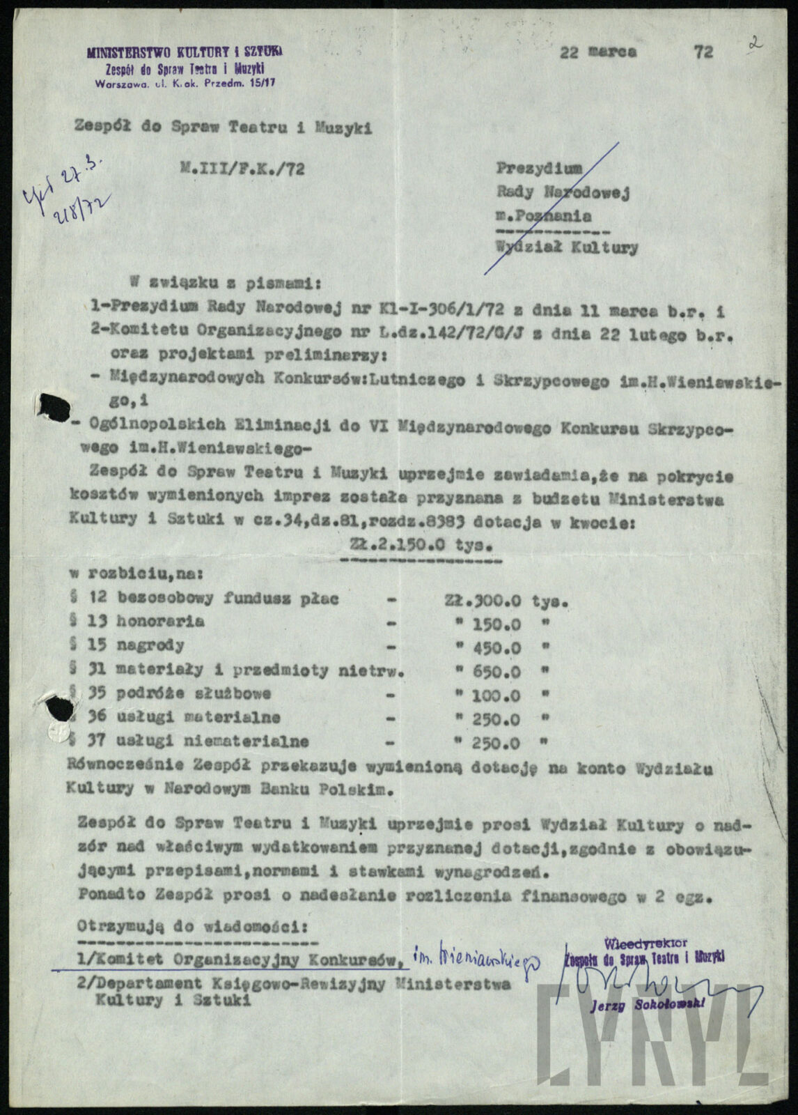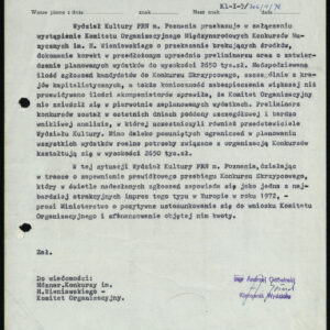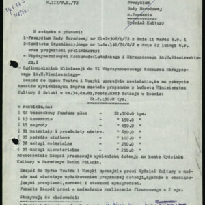 Korespondencja związana z kosztami przeznaczonymi na organizację Międzynarodowych Konkursów im. Henryka Wieniawskiego (lutniczego i skrzypcowego)22.03.1972